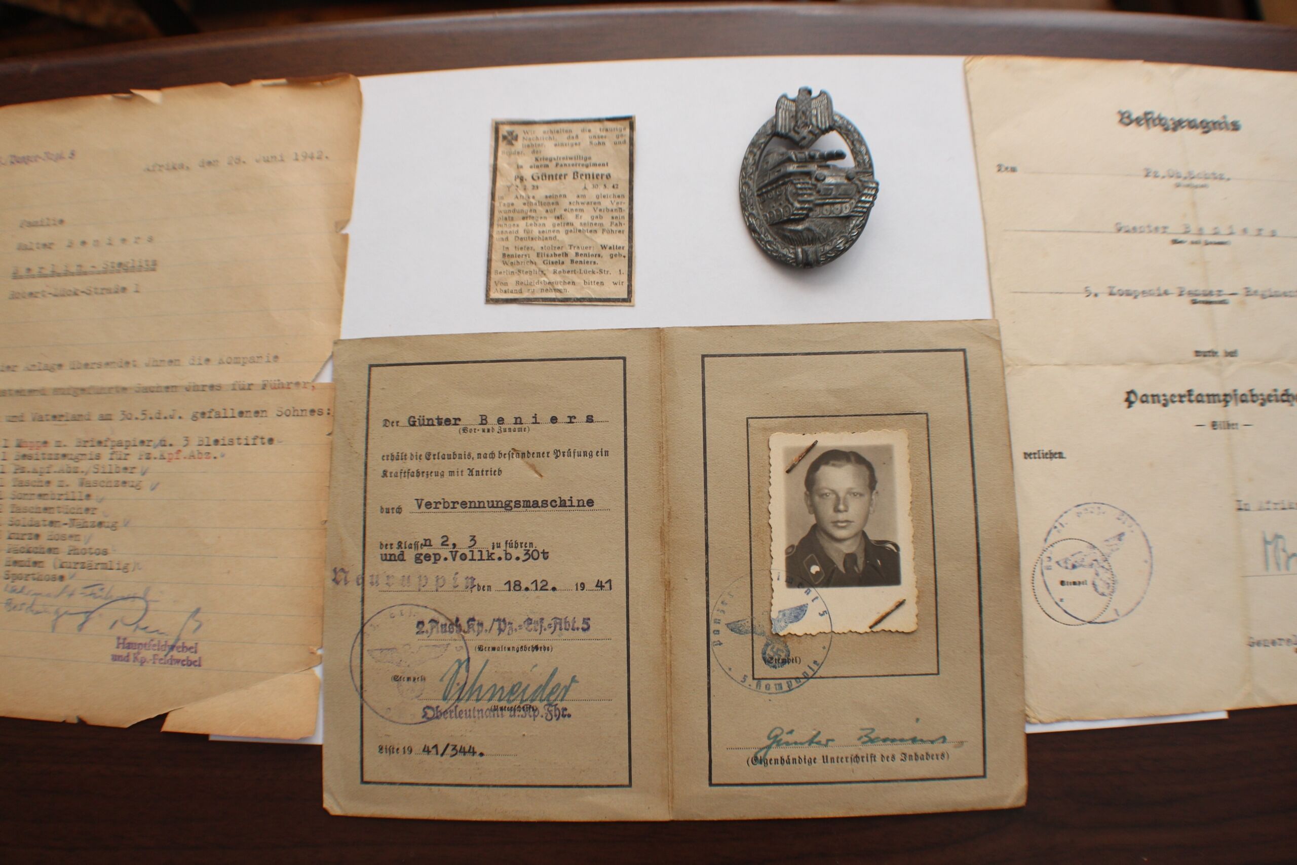 Günter Beniers was hit in his tank not far from the town of Sidi Mufta (Libya) his tanks was among 11 tanks hit in that action. He died later that day of his injuries in a small field hospital near the front on 30.4.1942. At this time someone form his unit took his Tank Drivers Licence, his Panzer Badge and his Award Document for the Panzer Assault badge in Silver among other things he sent them home. To know that these items were taken from his body and sent home makes this grouping a very interesting and historical grouping and a very rare set.