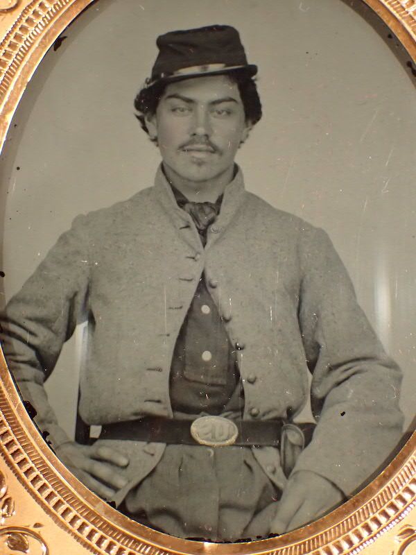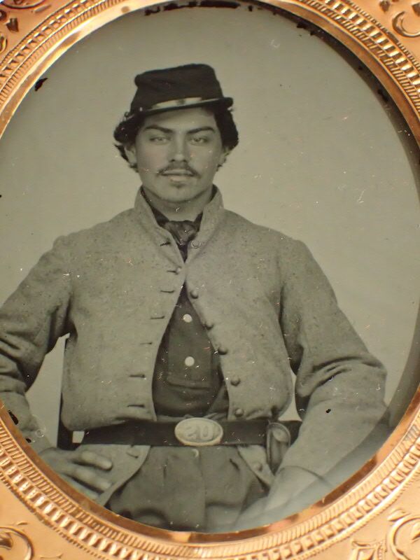Tintype Photo in Leather Case with brass hinge – showing a colourised tin type photo in US Union Uniform