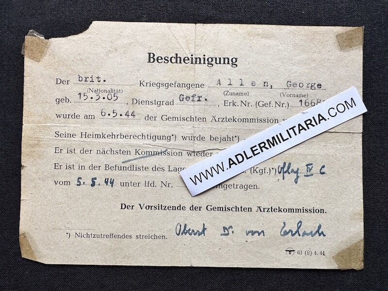 - Certificate of discharge from the Mixed Medical Commision on the 5.5.1944 issued at Colditz, it was signed by the famous Swiss Col, Dr von Erlach. Interestingly, L\Cpl G R Allen was the first to be approved from those presented to the commission. This German issued document, signed by the Swiss is the only known such example and is extremely rare.