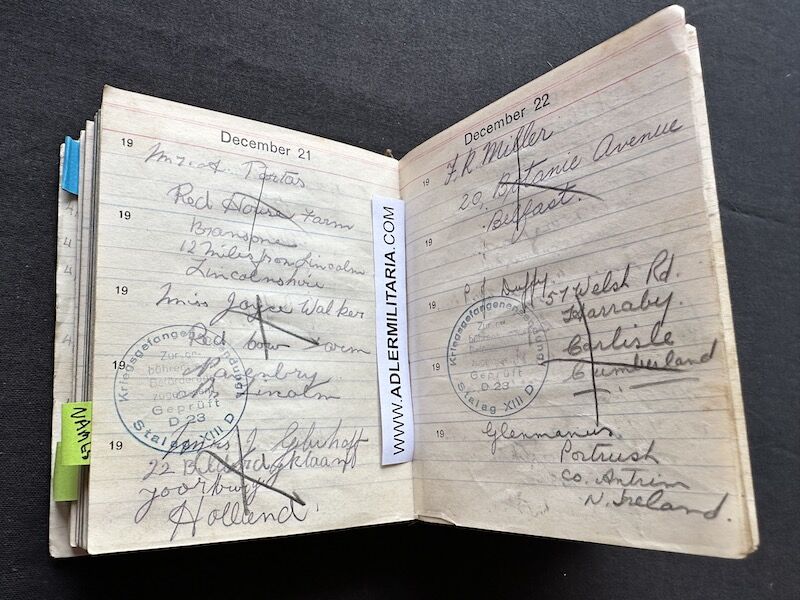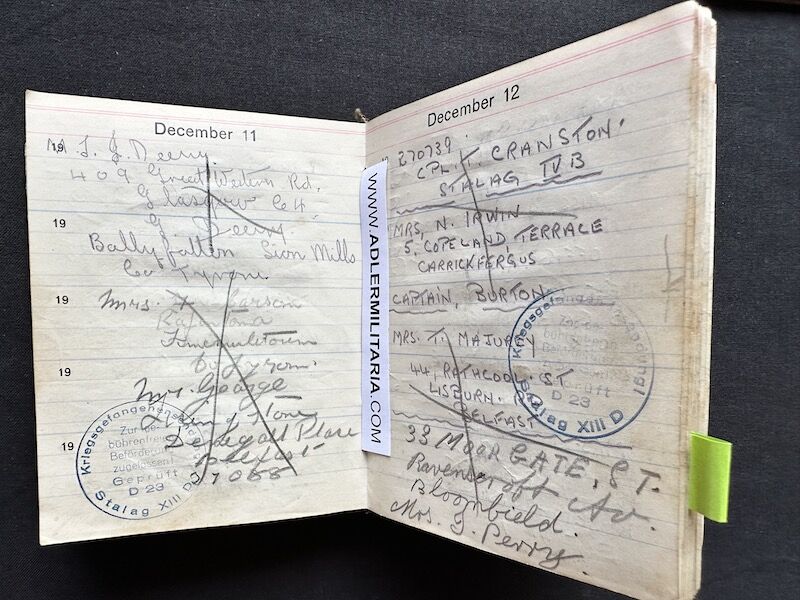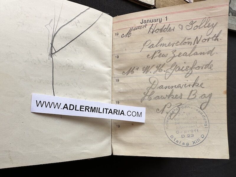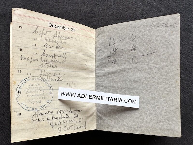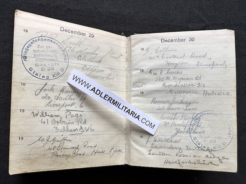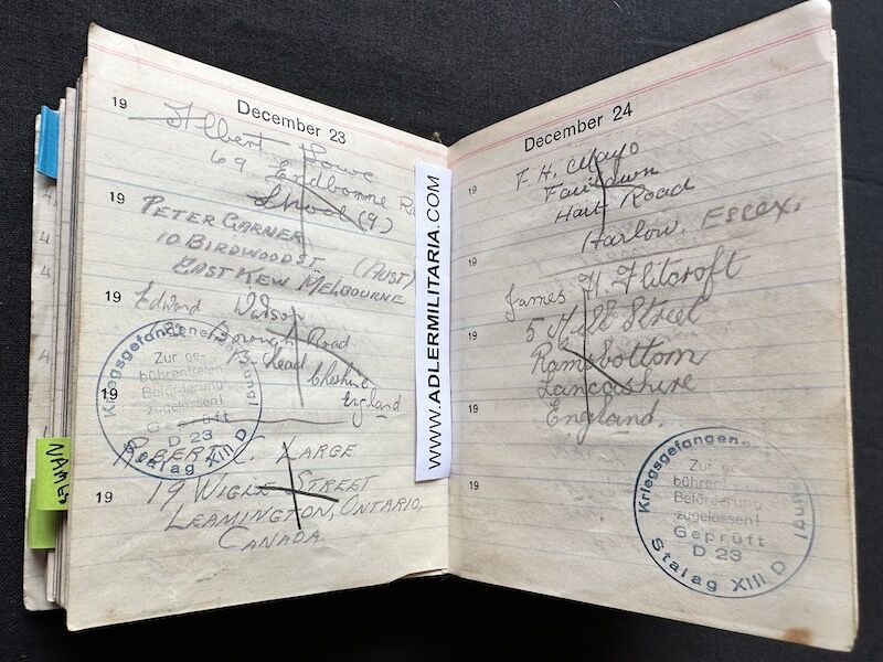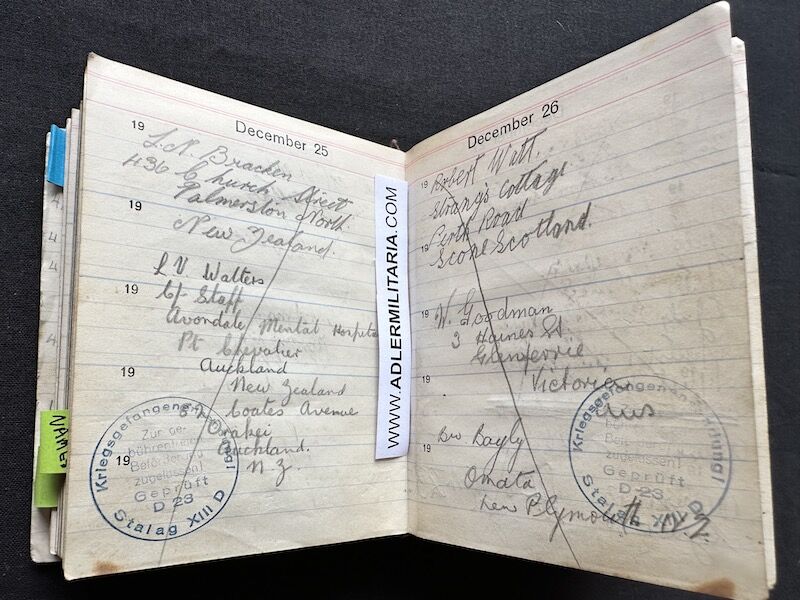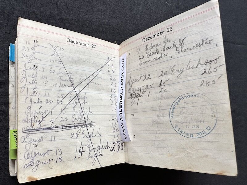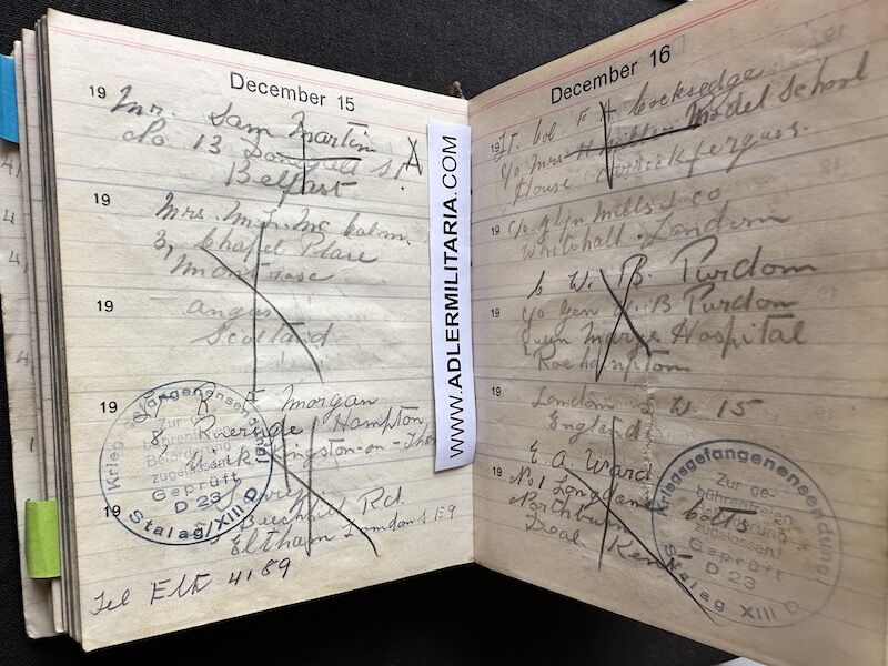 - Pocket Diary of L\Cpl Allen carried with him from his capture on the beach at Dunkirk to Colditz castle. Many entries, including some poems and many names and addresses of many Colditz POWs. Including some famous POWS such as the former Maj-Gen Purdon. It is highly plausible that Allen knew personally the men he had entered in his diary. Every entry in the diary was subject to close inspection by the Germans (individually stamped on inspection).
