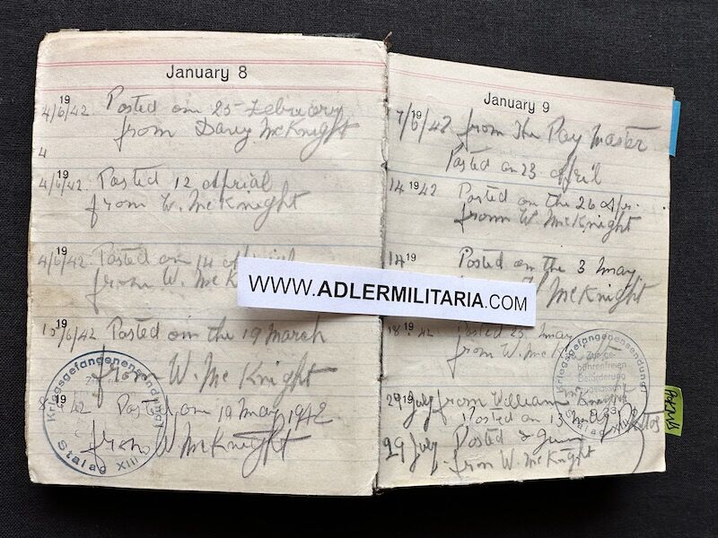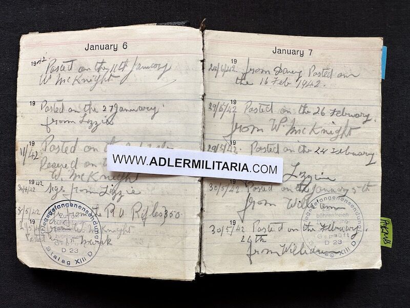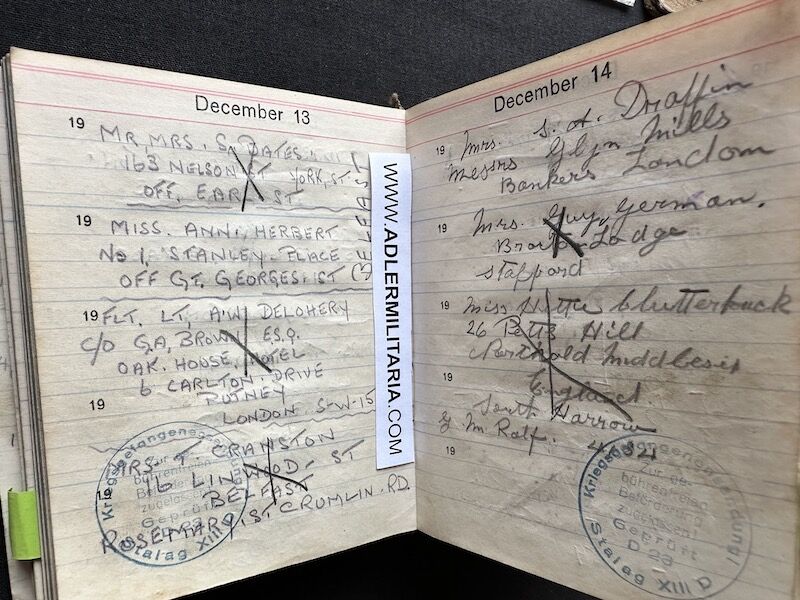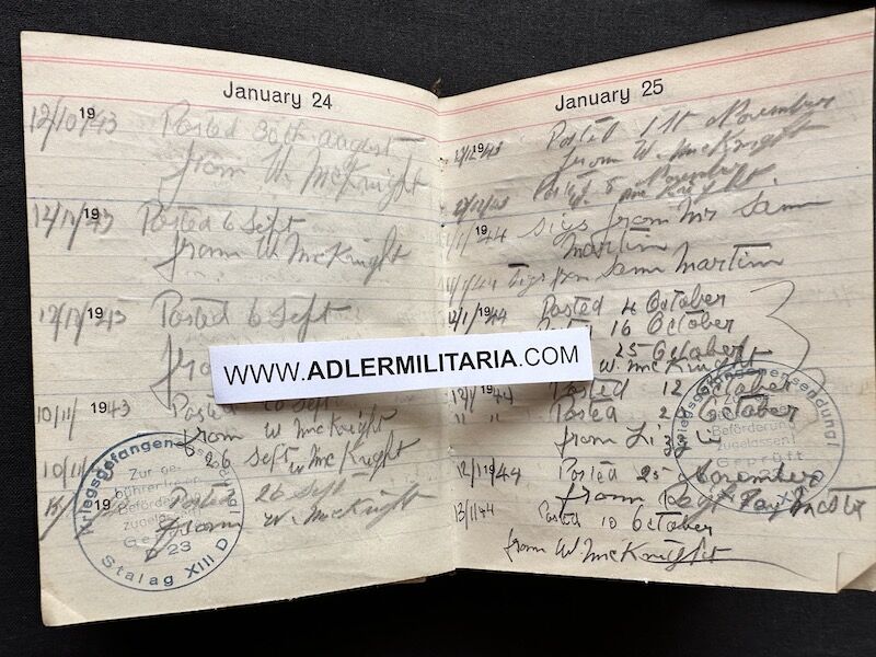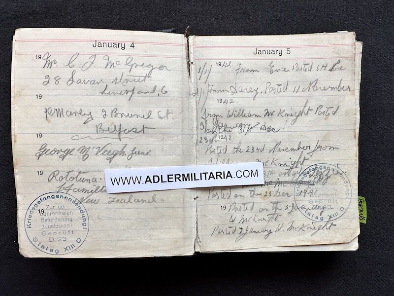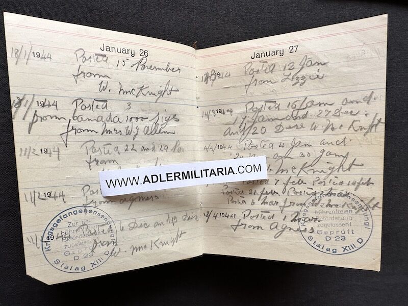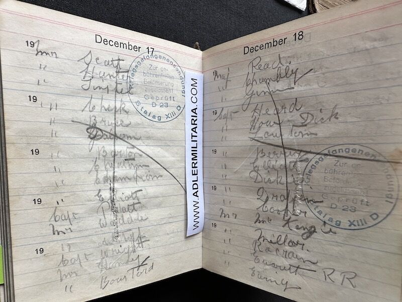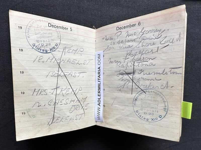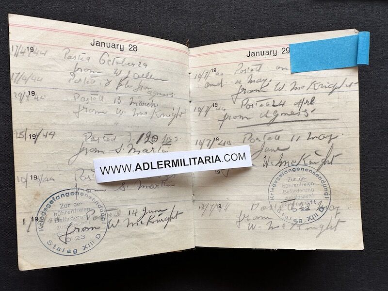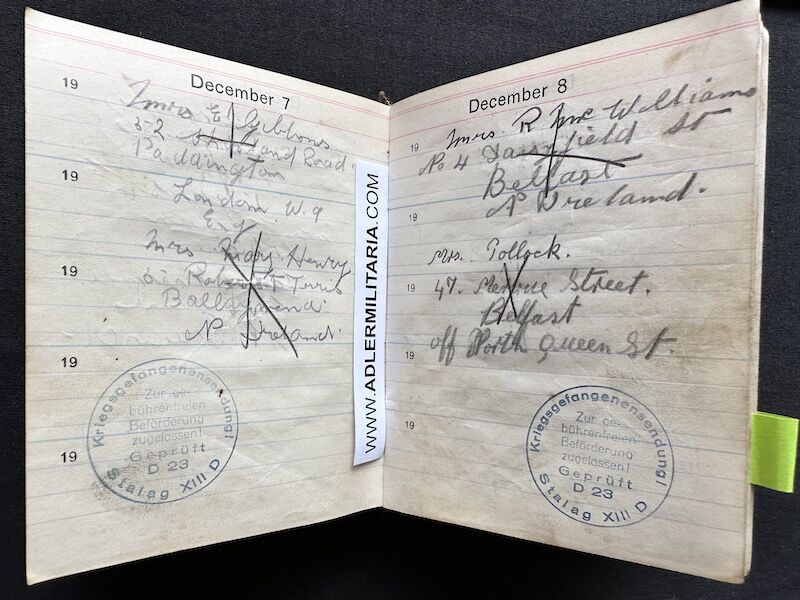 - Pocket Diary of L\Cpl Allen carried with him from his capture on the beach at Dunkirk to Colditz castle. Many entries, including some poems and many names and addresses of many Colditz POWs. Including some famous POWS such as the former Maj-Gen Purdon. It is highly plausible that Allen knew personally the men he had entered in his diary. Every entry in the diary was subject to close inspection by the Germans (individually stamped on inspection).