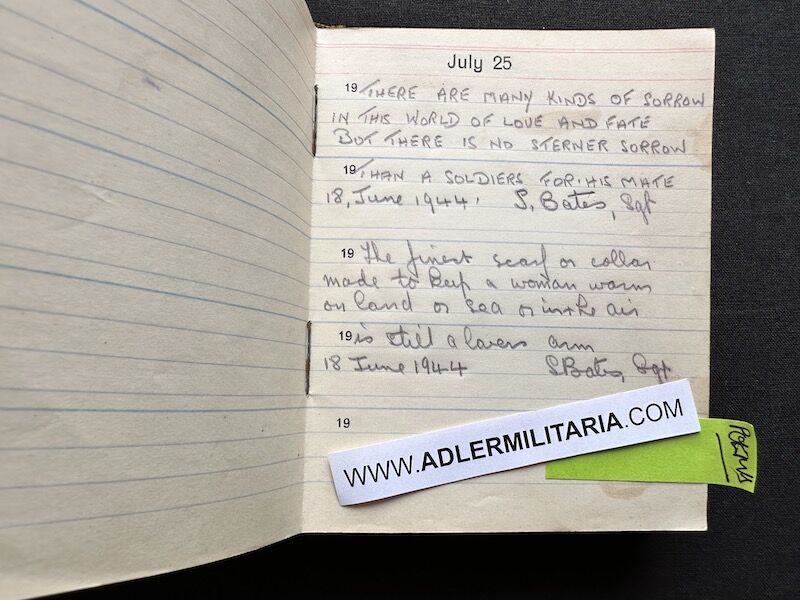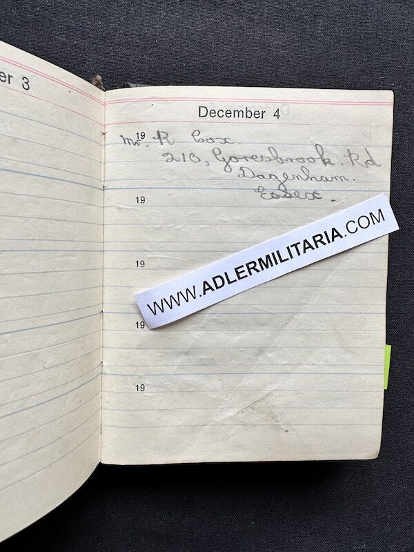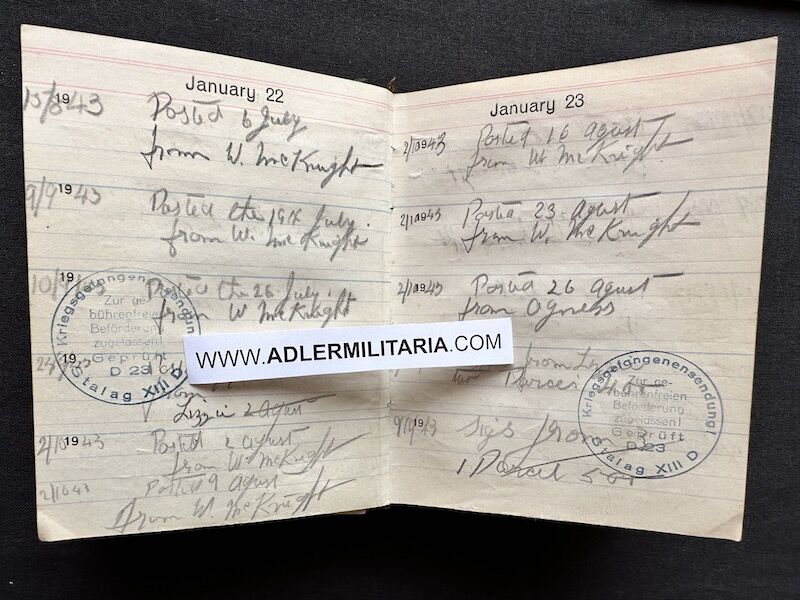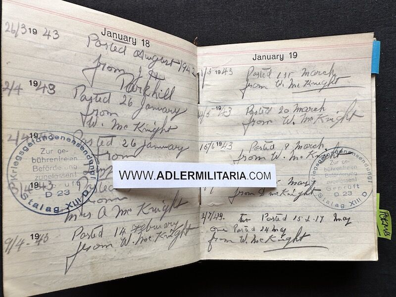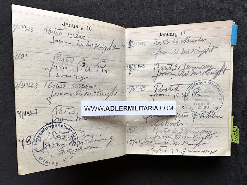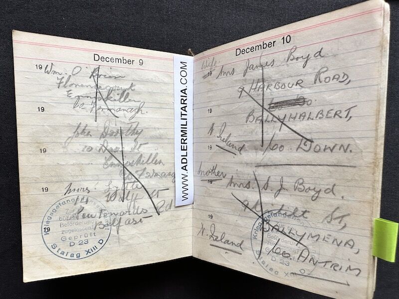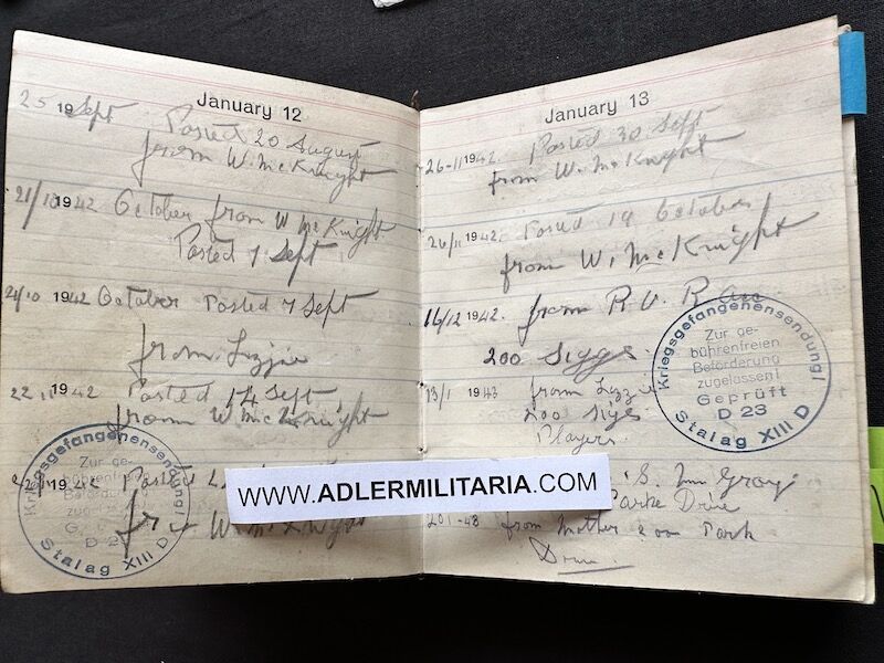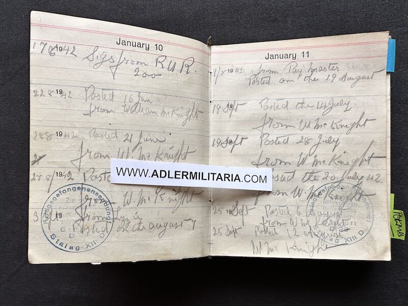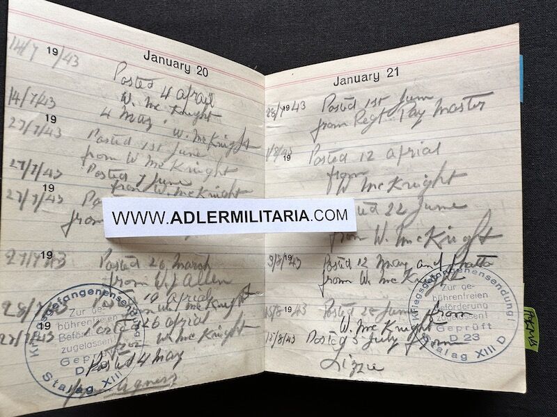 - Pocket Diary of L\Cpl Allen carried with him from his capture on the beach at Dunkirk to Colditz castle. Many entries, including some poems and many names and addresses of many Colditz POWs. Including some famous POWS such as the former Maj-Gen Purdon. It is highly plausible that Allen knew personally the men he had entered in his diary. Every entry in the diary was subject to close inspection by the Germans (individually stamped on inspection).