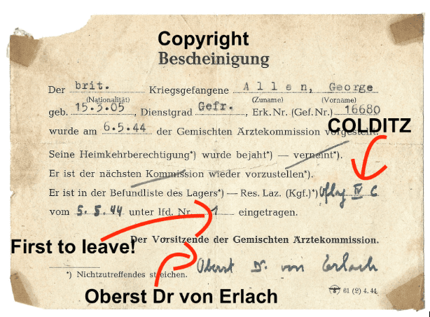 The Mixed Medical Commission (acting under the Geneva Convention) inspected Allen on their only visit to Colditz. The leading doctor of the MMC was the Swiss Colonel Dr von Erlach. He personally cleared Allen on that very special document in the picture in May 1944 at Colditz.