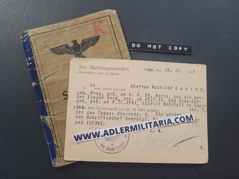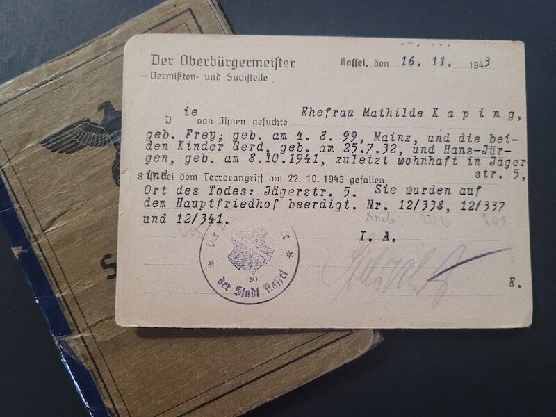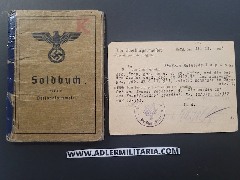 In the rear of the Soldbuch was a post card to Horsts father, Heinrich stating that he had lost his wife and two children on a bombing raid on Kassel. The raid on Kassel was on the 22.October 1943 and killed around 10,000 people of the city and displaced over 100,000 people. Interestingly, Horst was allowed to go home for a few days because of the loss of the home and family. The sadness, would not end for the Kaping family, as Horst was killed in action also in Poland in January 1945. The father lost three children and his wife and his home in Kassel.