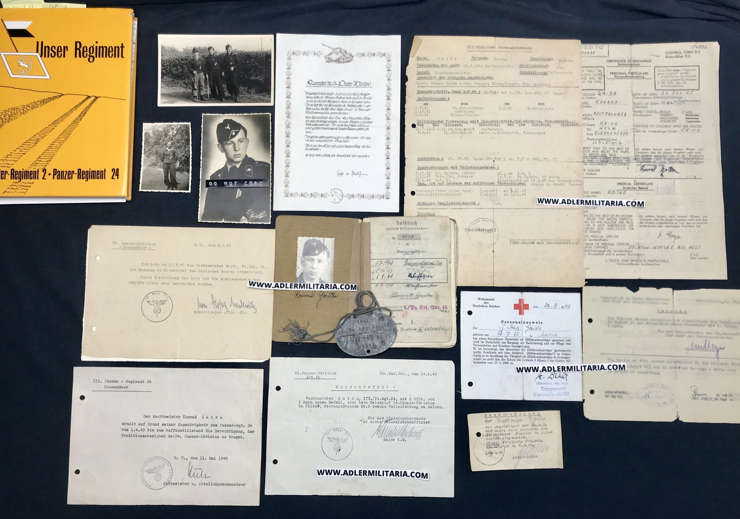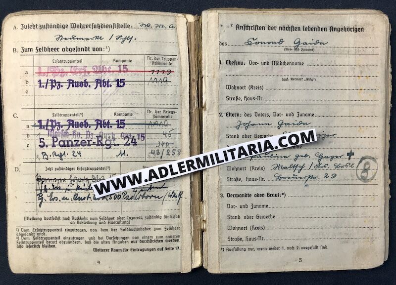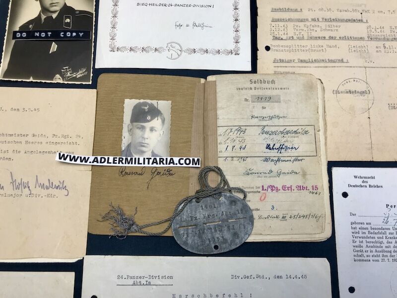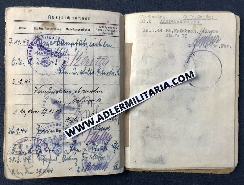 Heer Soldbuch – Wachmeister Gaida – Panzer 4 Commander – Panzer Regiment 24 (24 Panzer Division) – Pz Badge 25 – Honor Roll Clasp – 11 Tank KILLS! 49 Panzer Days! (SOLD)