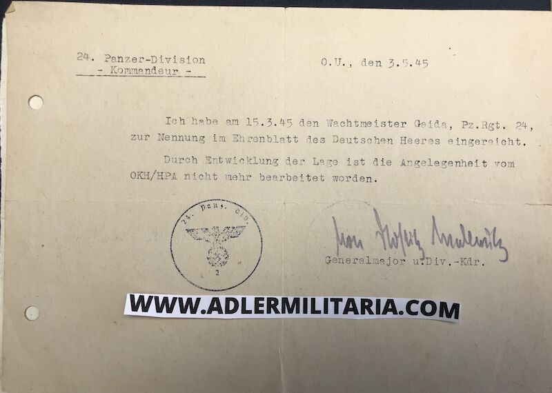 - A certificate stating that Gaida, was mentioned in the Honor Roll of the German Army. Signed by Knights Cross Holder: Generalmajor Gustav-Adolf von Nostitz-Wallwitz (very rare signature as he died in 1945).