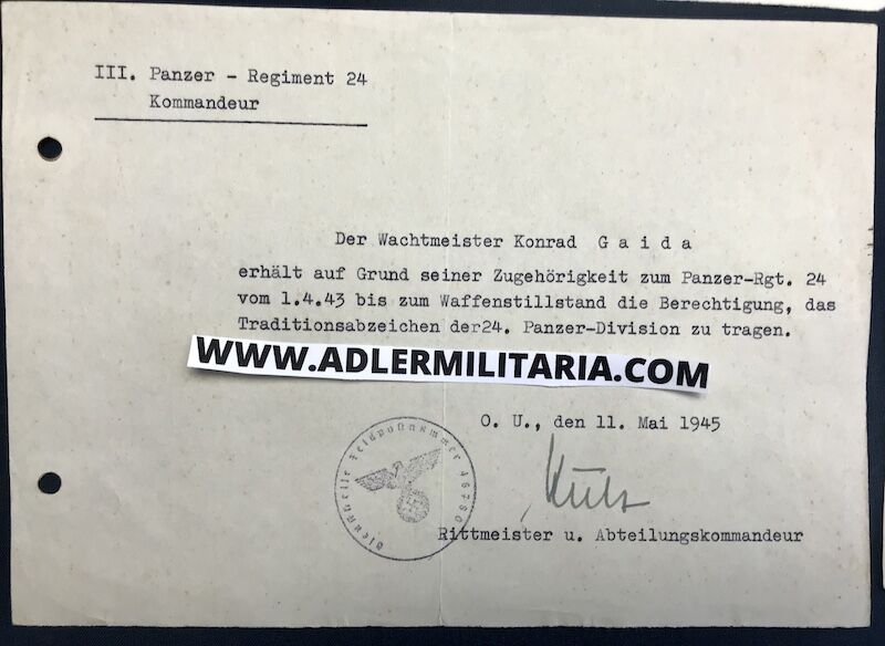 - A Certificate allowing him to wear the Traditional Badge of the 24th Panzer Division! ”Leaping Horse” Signed by Knights Cross Holder Major Kuls (Kuls, Wolfgang 24.02.1945 Rittmeister Kdr III./Pz.Rgt 24)