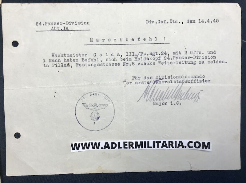 - Marching Order – 14.4.1945 – They were reported to go to Pillau to report. Likely without their tank at this stage! Signed by: Knights Cross Holder Major von Knebel-Doeberitz (11.05.1945 Major i.G. Ia 24. Pz.Div)