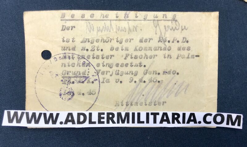 - Certificate that Gaida is now a member of Rittmeister Fischers Command in Palmnicken – 9.4.1945 signed by Fischer (Likely German Cross in Gold Holder: