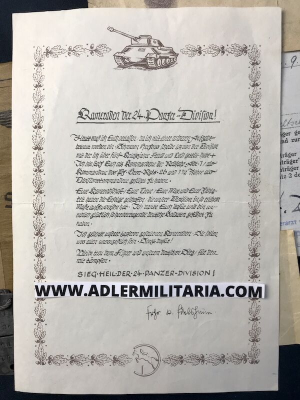 - 24 Panzer Division Flyer – These are also rarely seen a personal speech from von Edelsheim to the men of the 24th Panzer Division!