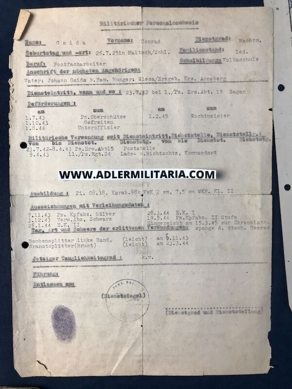 Conrad Gaida was born in July 1925, by 1942 he was in a Panzer replacement unit and working the post room (humble start).