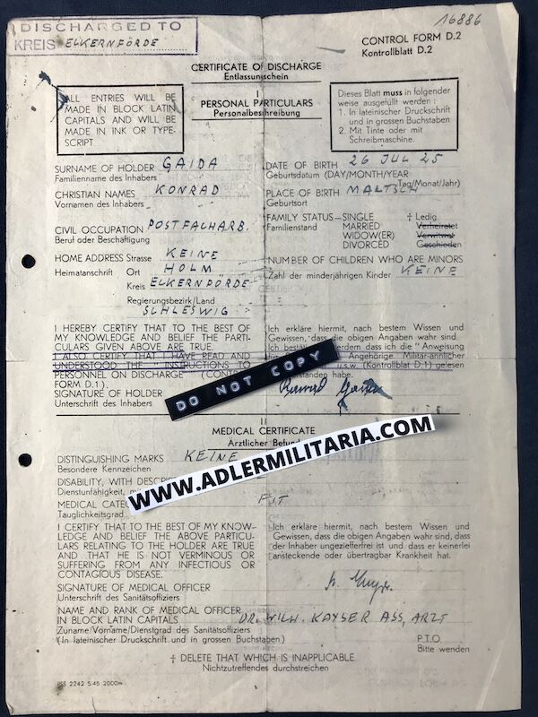 - Discharge Papers – Gaida was discharged and send home in 1946
