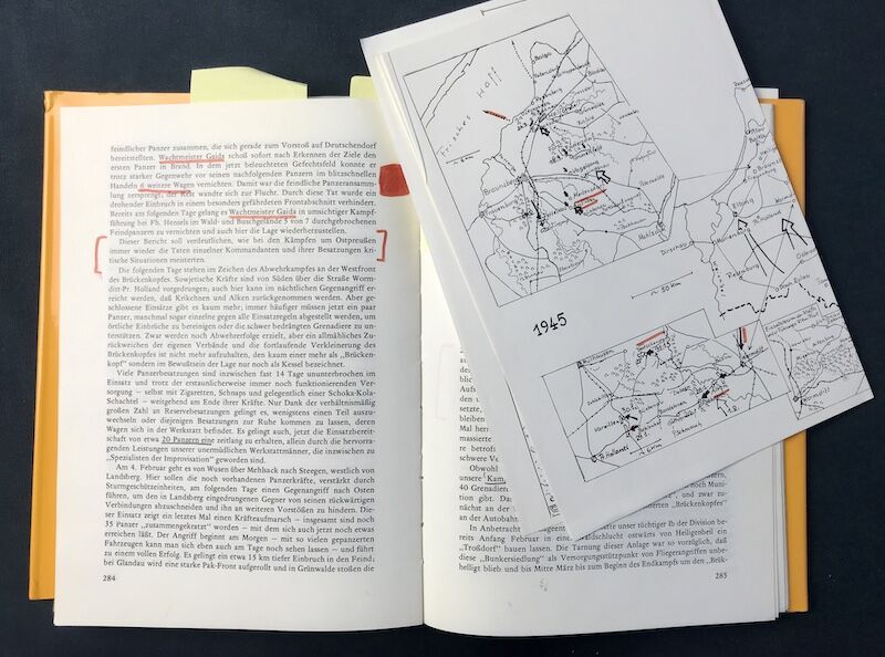 Page 283: Already the next day our tanks had to defend against an enemy tank attack on Deutschendorf, around 15 KM north east of Krawitten. The most forward tank was under the leadership of Oberlt Rehäuser, arriving in the night they immediately spotted a large number of heavy enemy tanks right opposite us! Commander of the first tank is Wachmesiter Gaida. In a report to the division, a special attention was given to the unusual circumstances of the attack. In near darkness, Gaida drove forward at a range of 200 meters in front of a row of enemy tanks, that were preparing to advance on Deutschendorf. Wachmeister Gaida shot immediately on the first tank into flames. Now in the lite up battlefield, and taking enemy fire in a lightning speed shot six more tanks! As a result, the enemy tanks broke up, the others retreated. Because of his actions, the dangerous attack was unsuccessful in this sector of the front (…) the next day Wachmeister Gaida fought in the forest and bushes destroying another 5 from 7 tanks that broke through the lines. This report highlights, how by the fighting in Eastern Prussia the individual actions of single tank commanders and their crews could master the situation.”