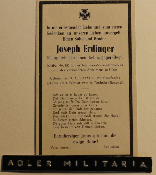 Josef Erdinger – GJ – EK2, IAB, WBS – KIA 1945 – Slovakia