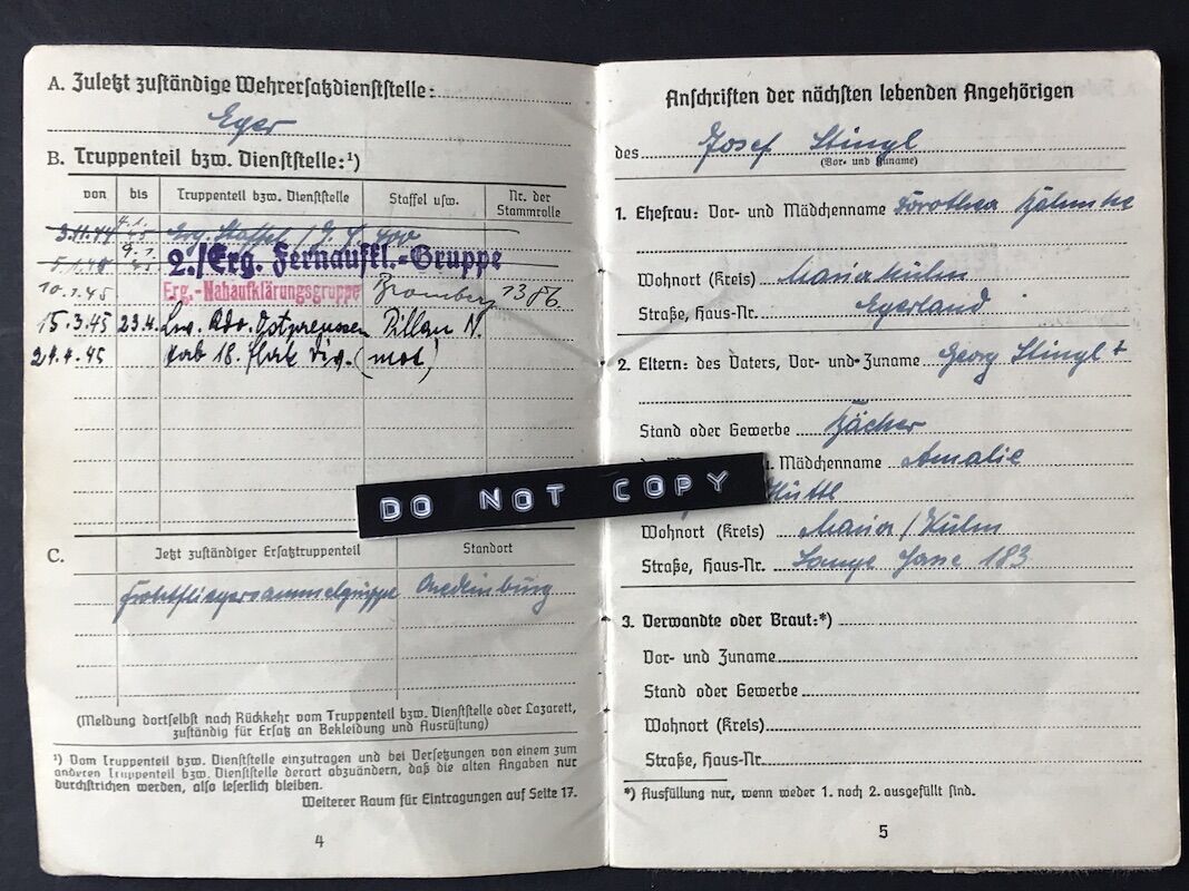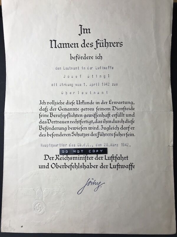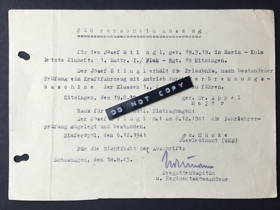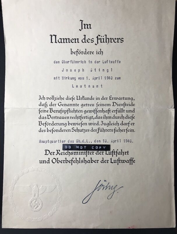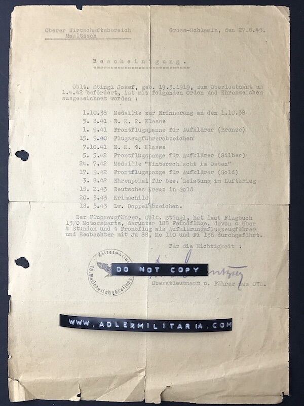 It would seem that when all the planes were out of action, Stingl was transferred to the 18th Flak Division Stab, although by this stage of the war 24.4.1945 they left East Prussia back to Germany.