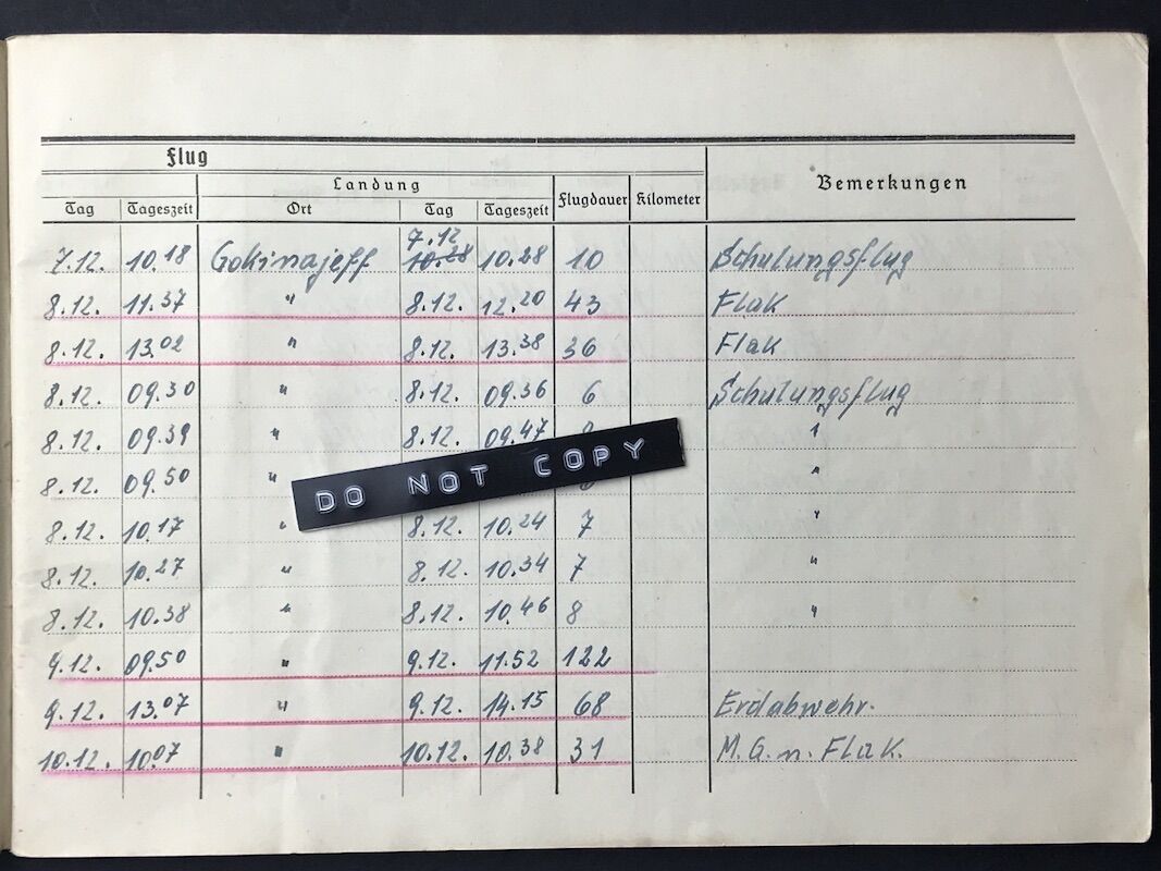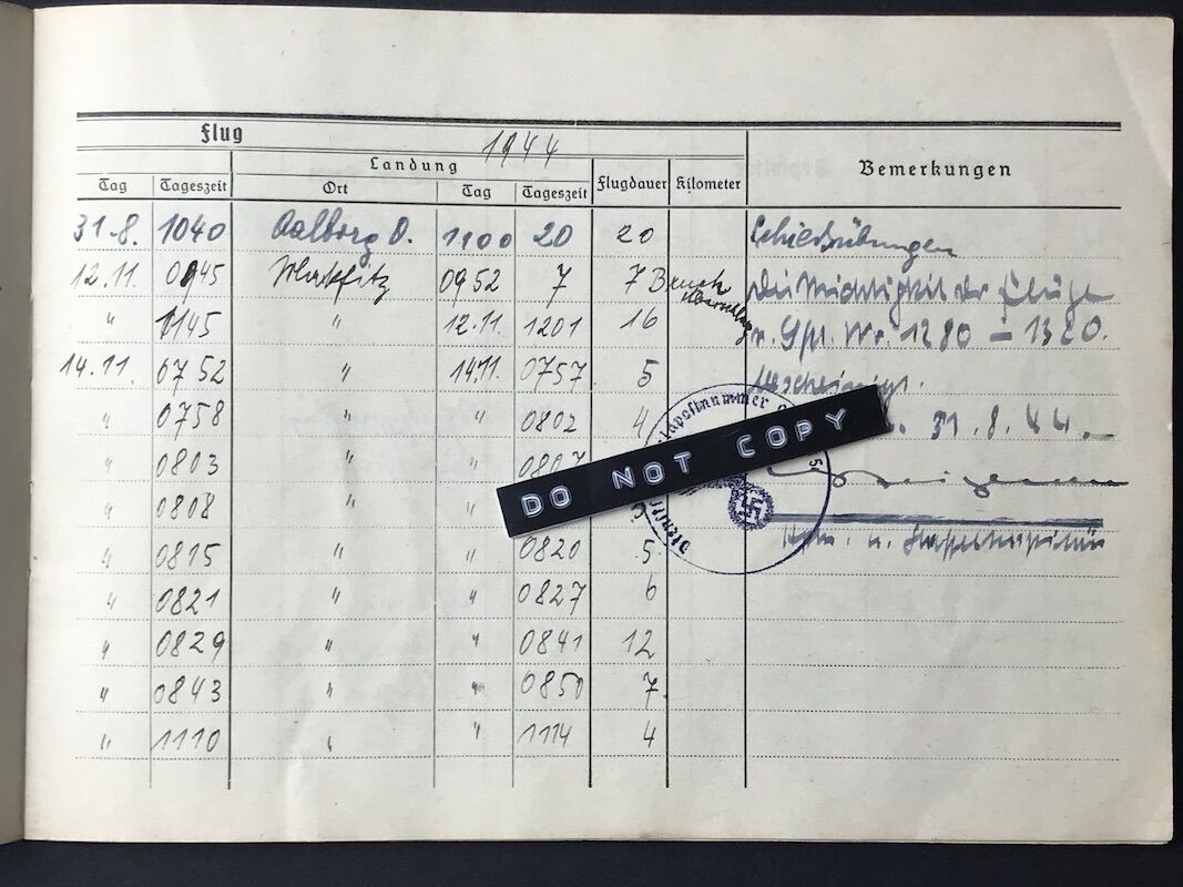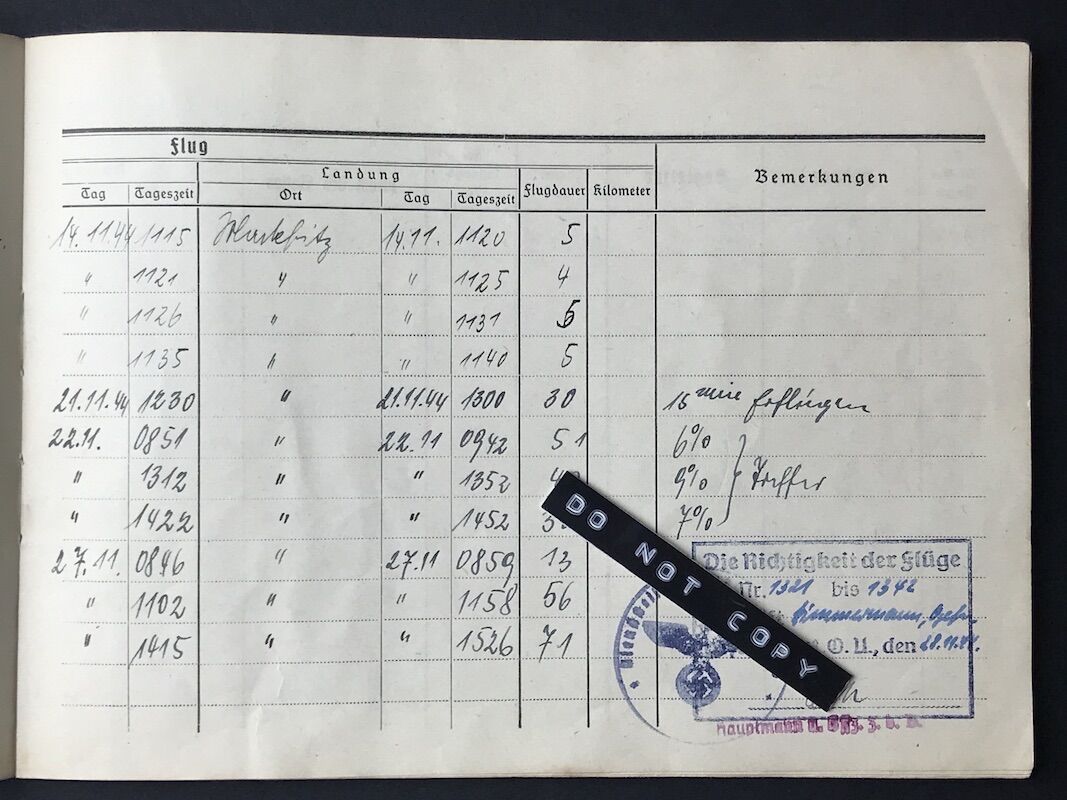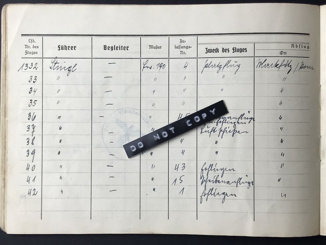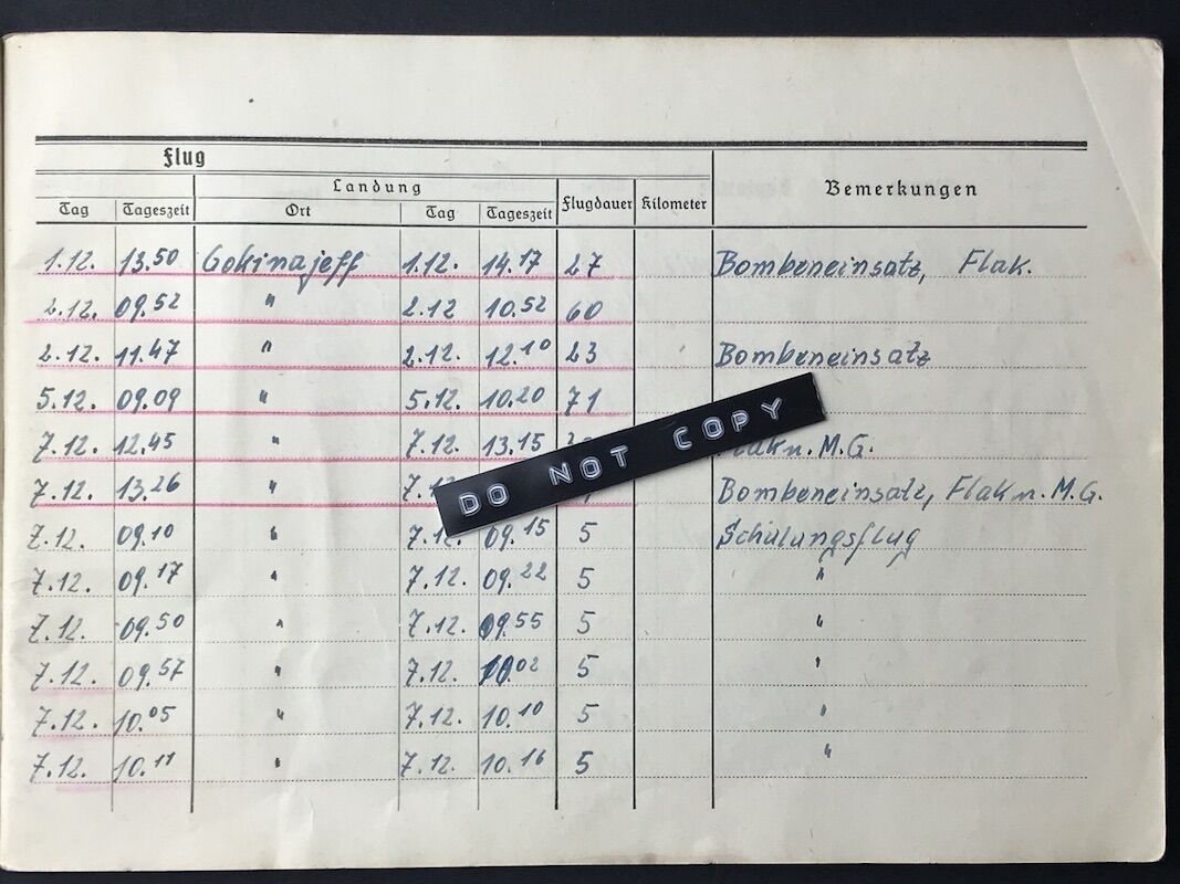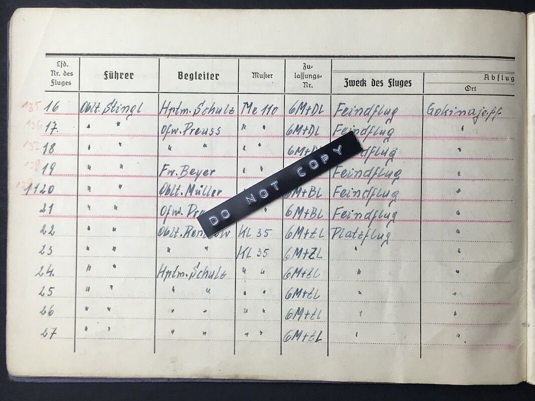 Interestingly, the Flugbuch displays an array of different flights, many of which were in enemy territory. It would also seem that not only was he in combat with the enemy in the air and ground targets but he was also shot down a few times. An interesting discussion about Stingls plane as well as pictures can be found here: