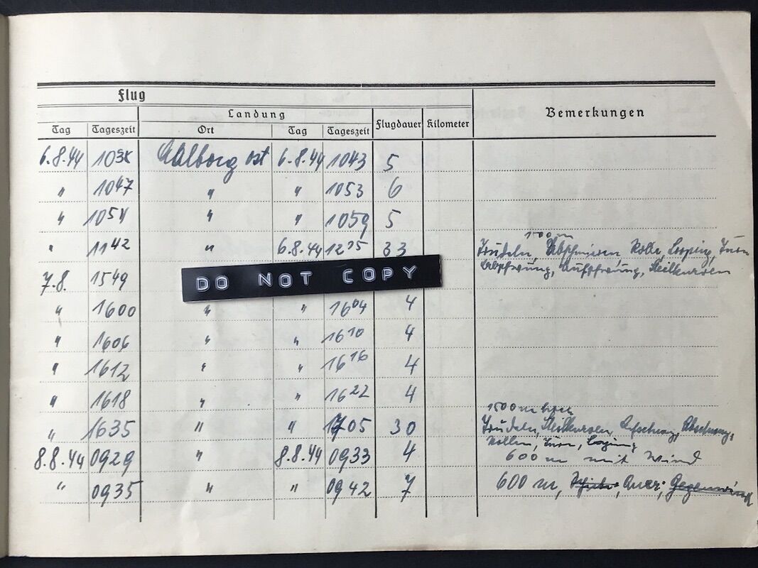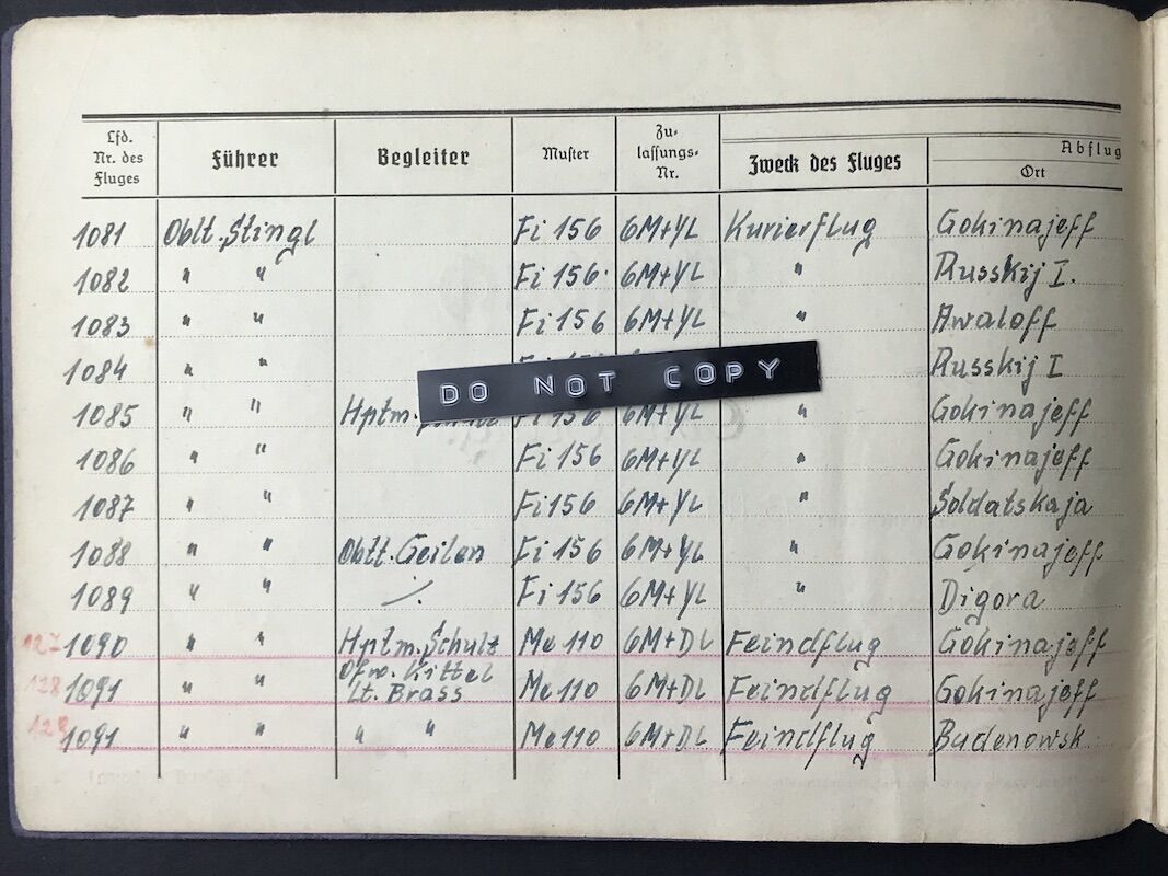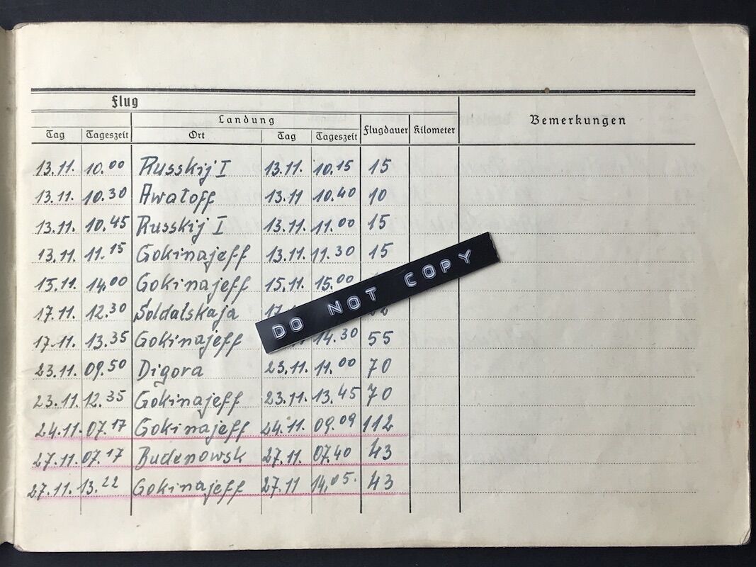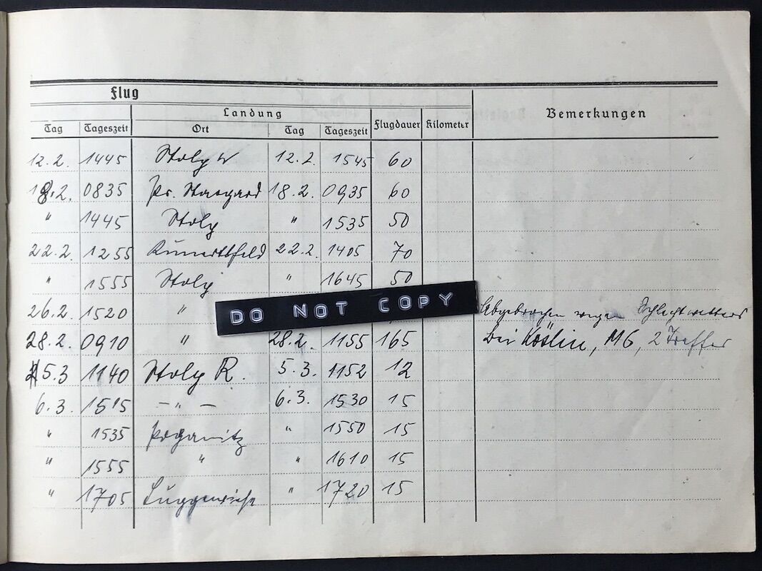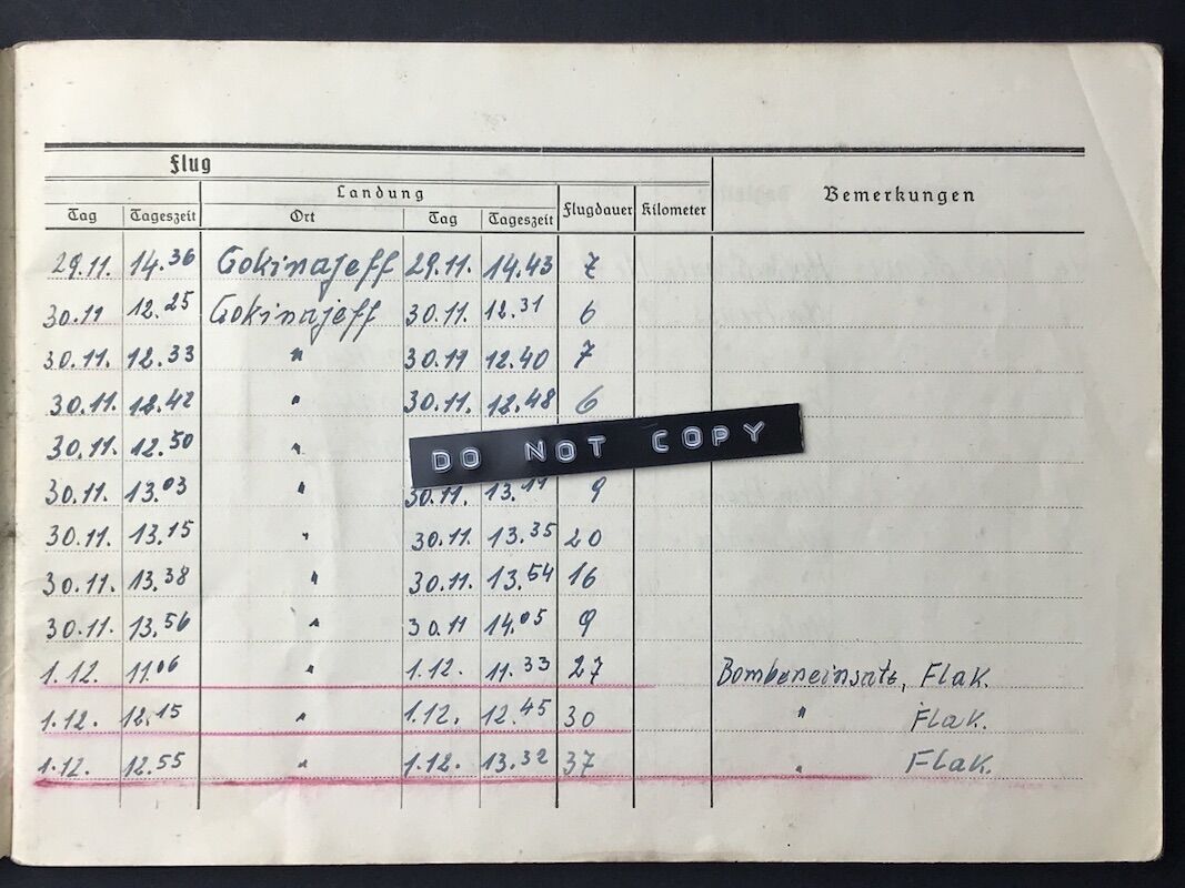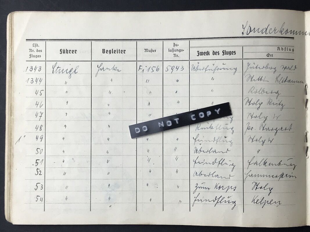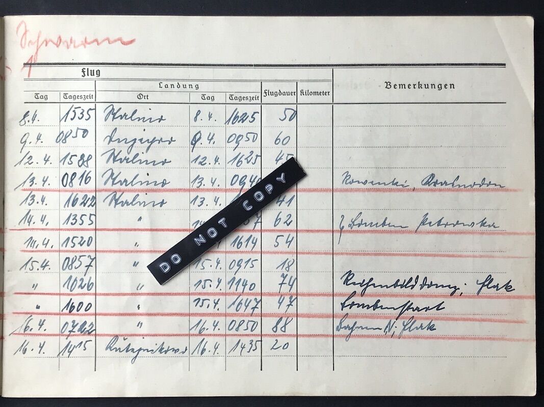 Interestingly, the Flugbuch displays an array of different flights, many of which were in enemy territory. It would also seem that not only was he in combat with the enemy in the air and ground targets but he was also shot down a few times. An interesting discussion about Stingls plane as well as pictures can be found here: