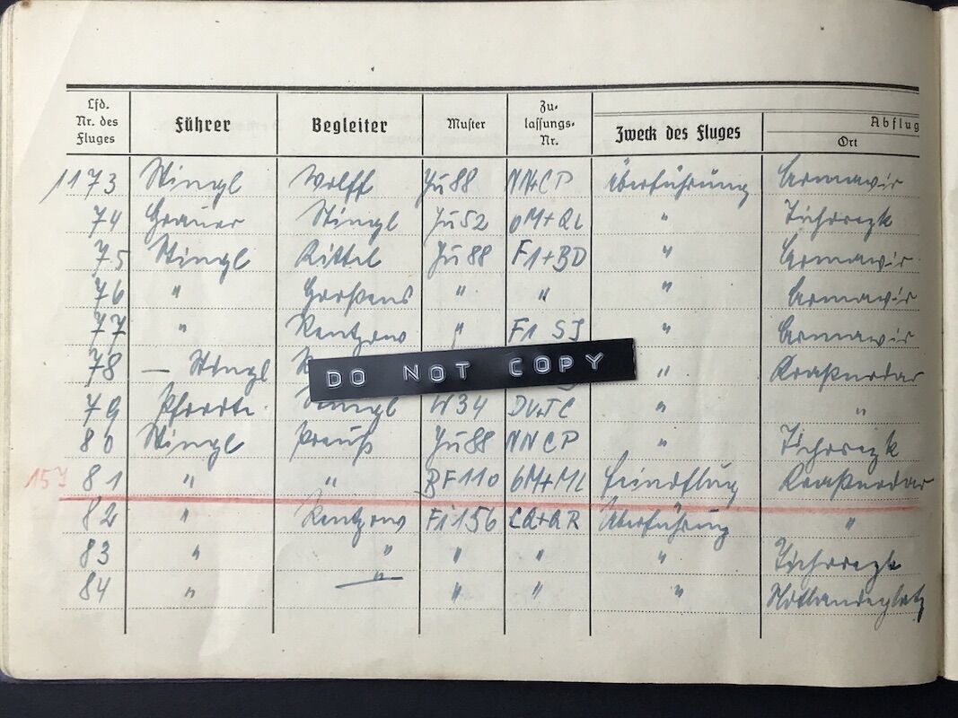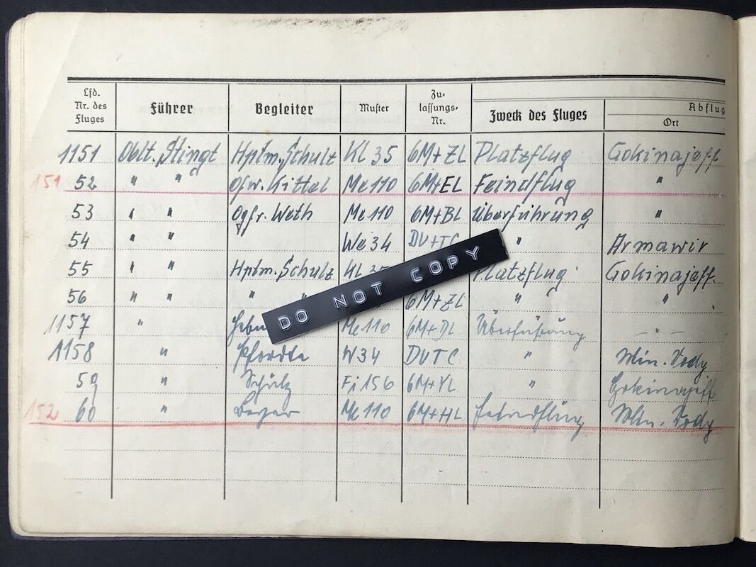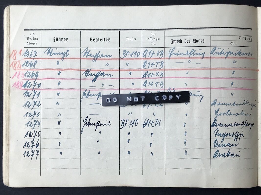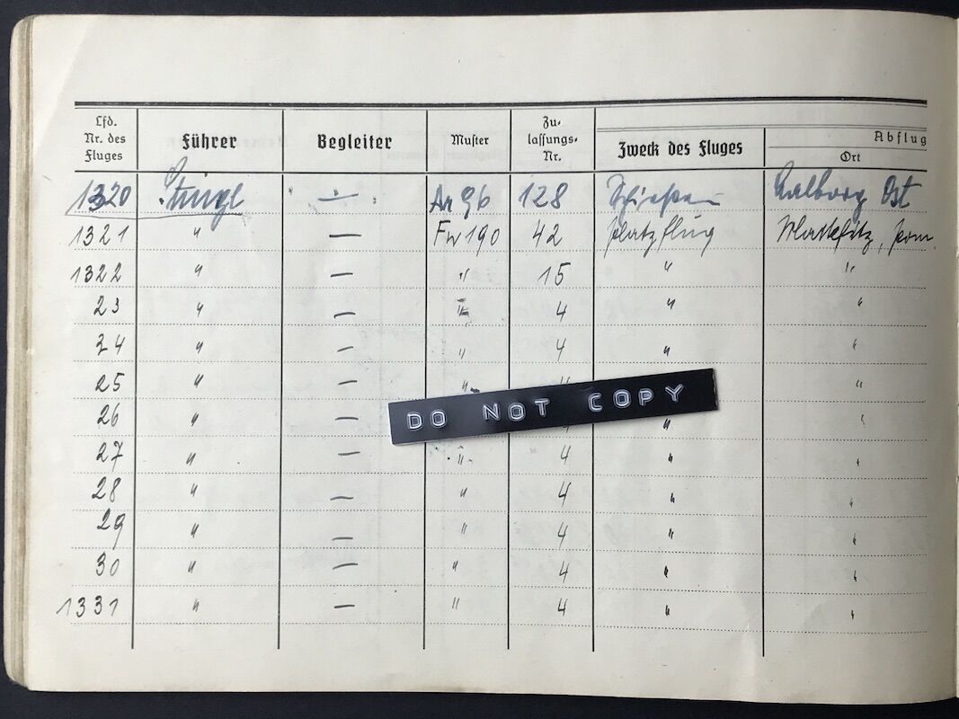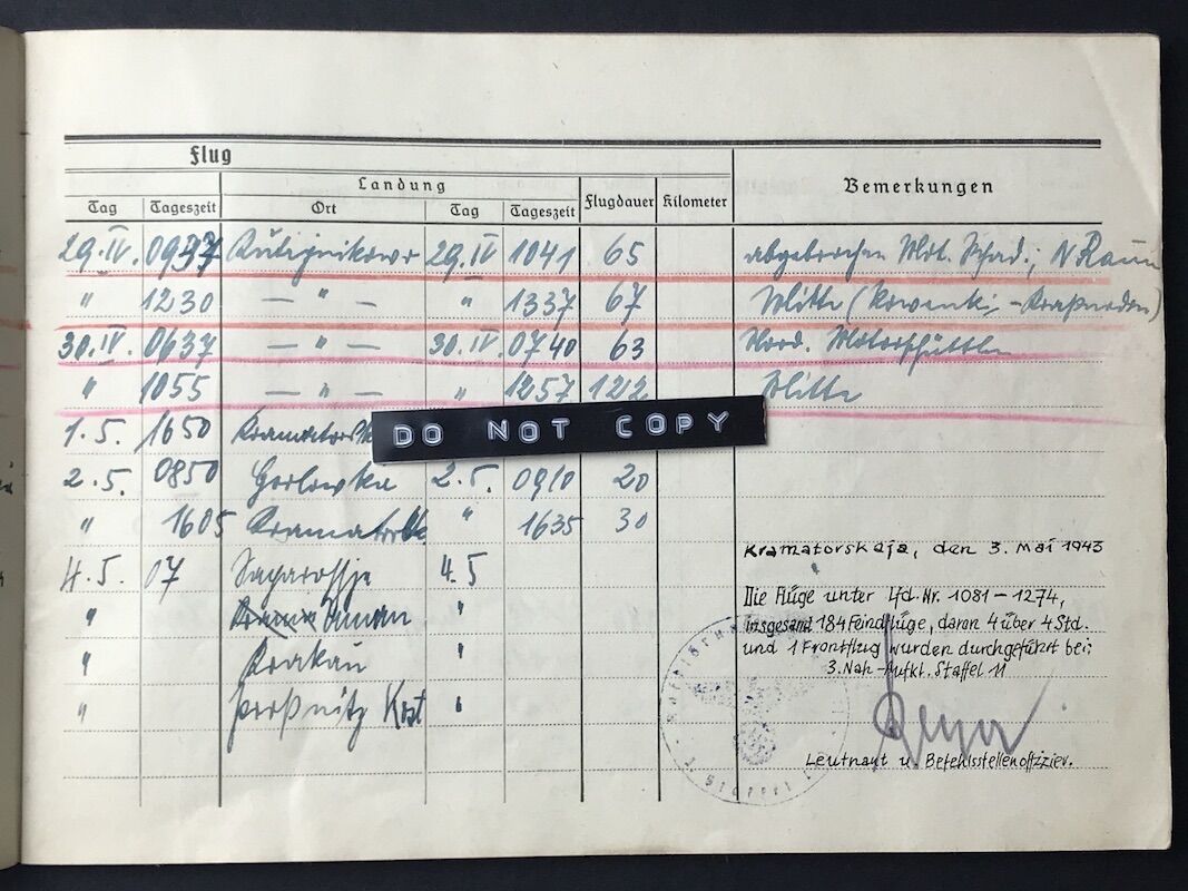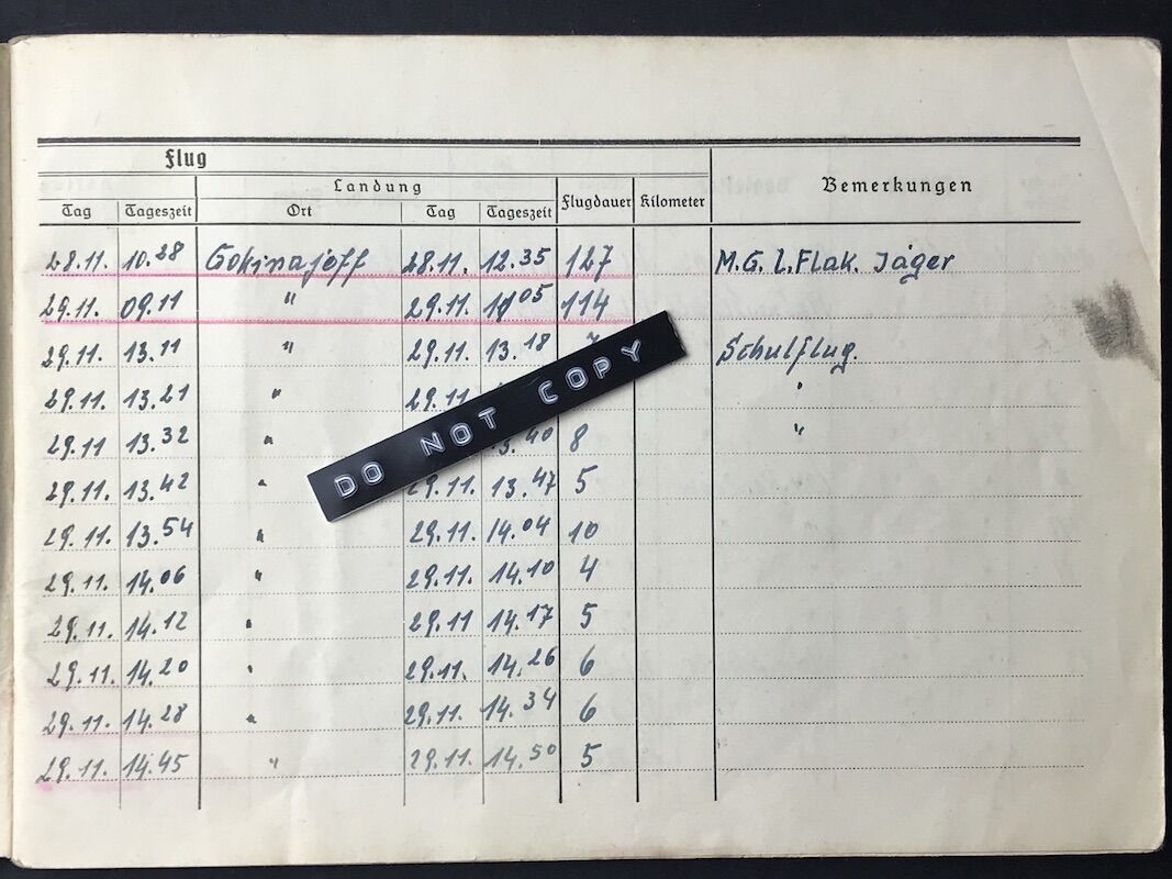 Interestingly, the Flugbuch displays an array of different flights, many of which were in enemy territory. It would also seem that not only was he in combat with the enemy in the air and ground targets but he was also shot down a few times. An interesting discussion about Stingls plane as well as pictures can be found here: