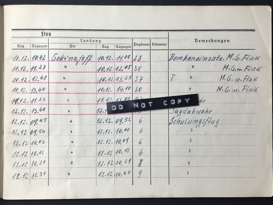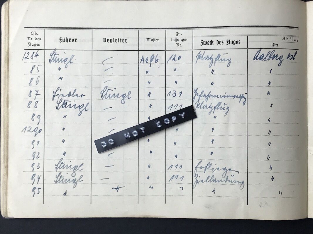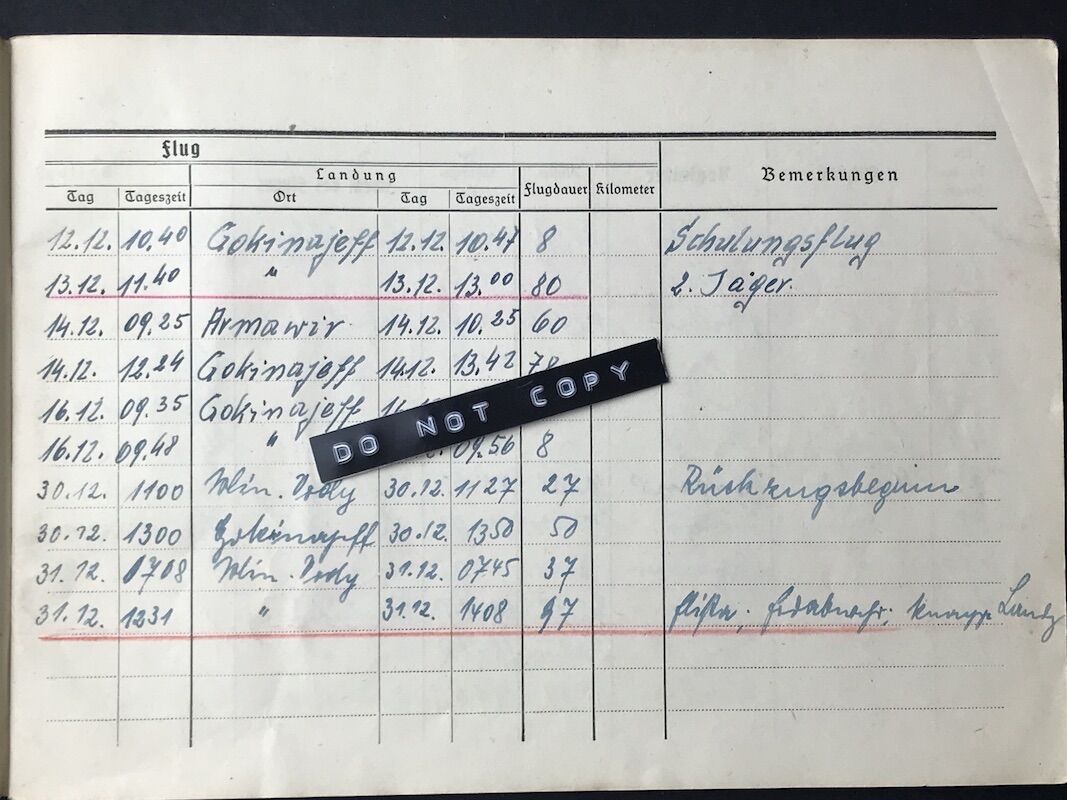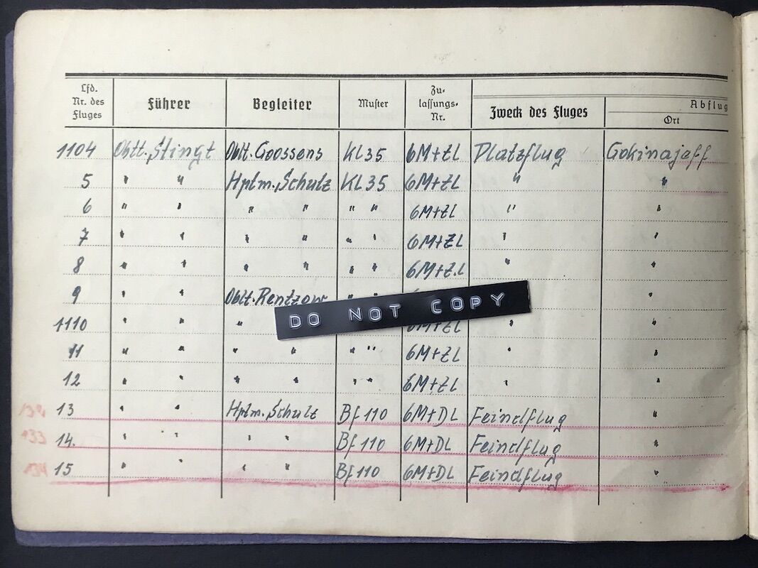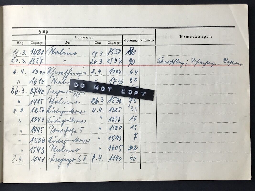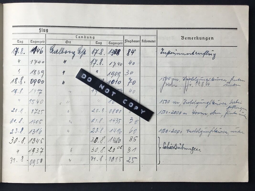 Interestingly, the Flugbuch displays an array of different flights, many of which were in enemy territory. It would also seem that not only was he in combat with the enemy in the air and ground targets but he was also shot down a few times. An interesting discussion about Stingls plane as well as pictures can be found here: