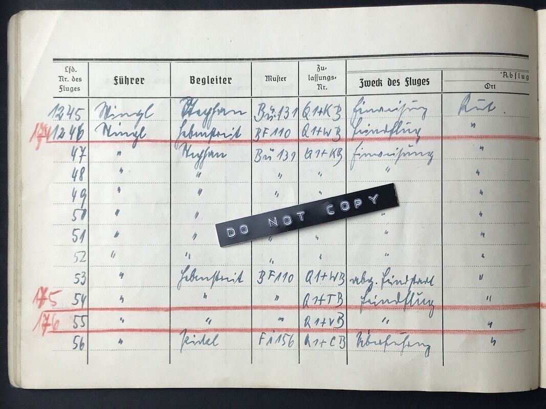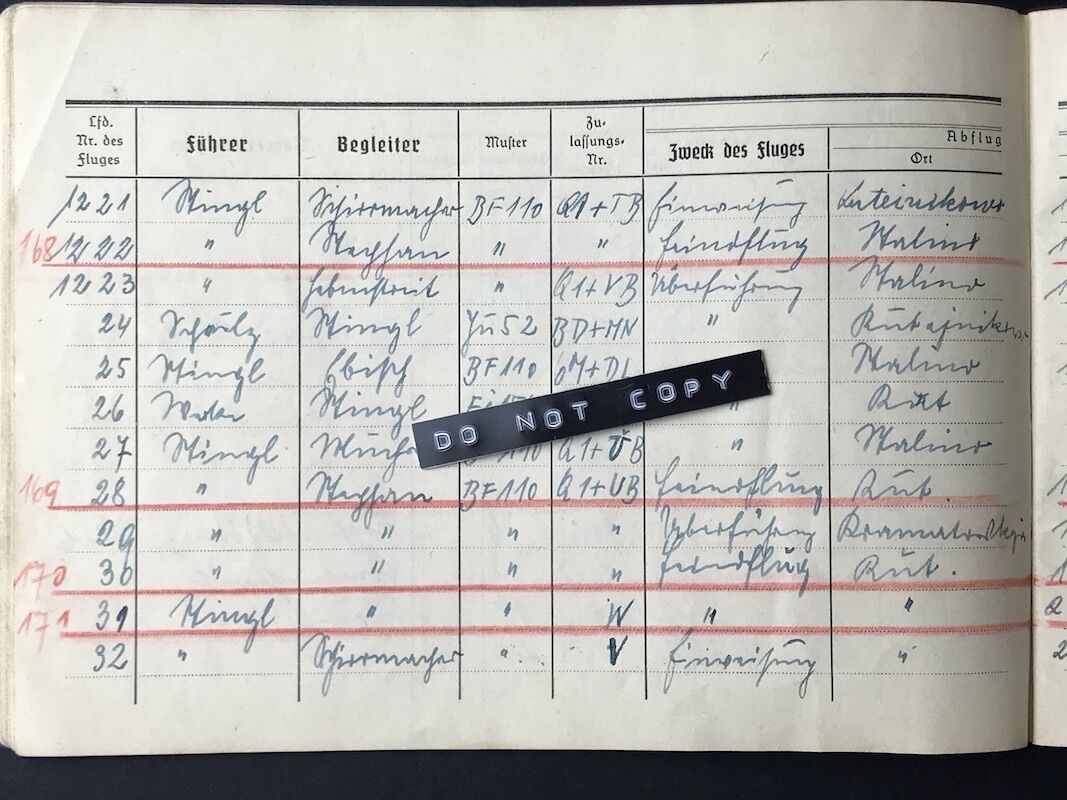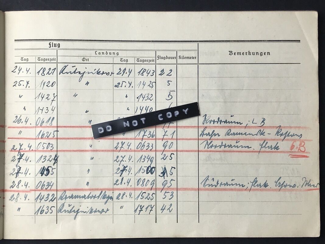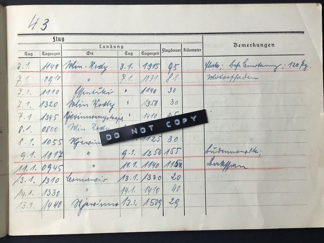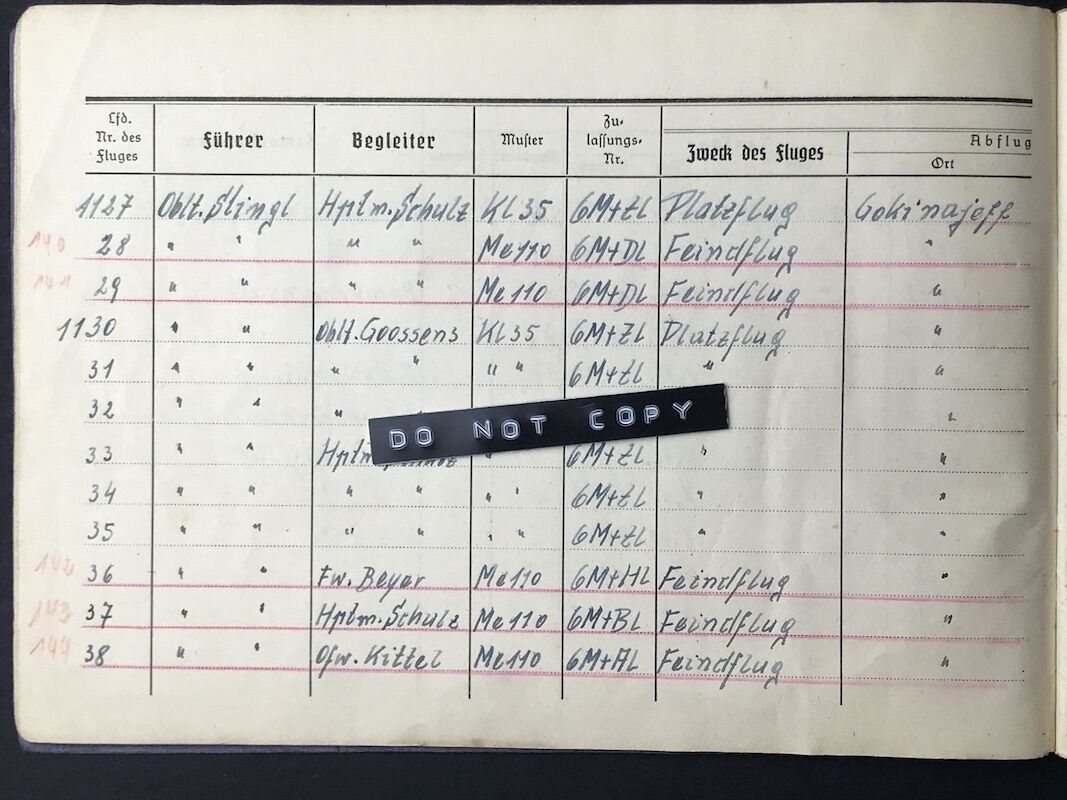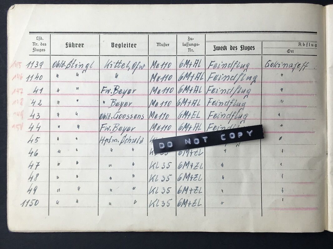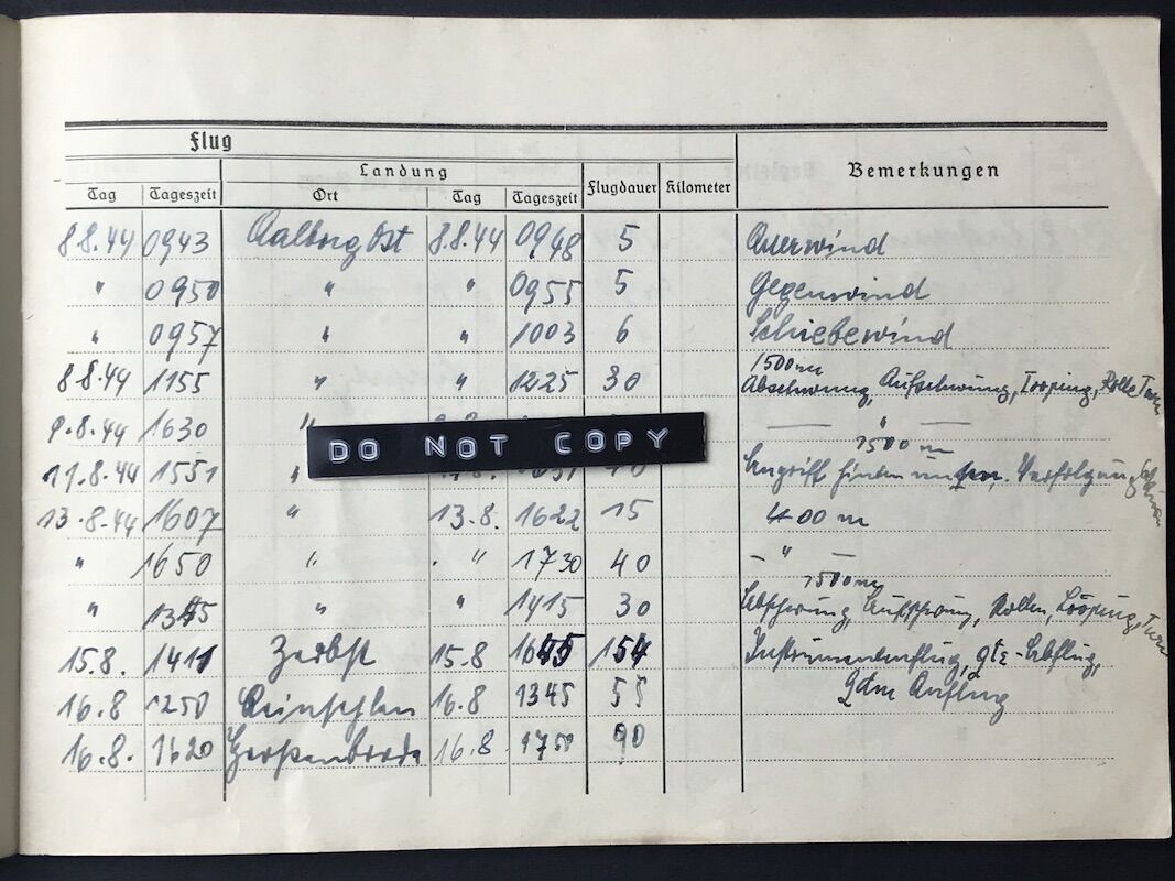 Interestingly, the Flugbuch displays an array of different flights, many of which were in enemy territory. It would also seem that not only was he in combat with the enemy in the air and ground targets but he was also shot down a few times. An interesting discussion about Stingls plane as well as pictures can be found here: