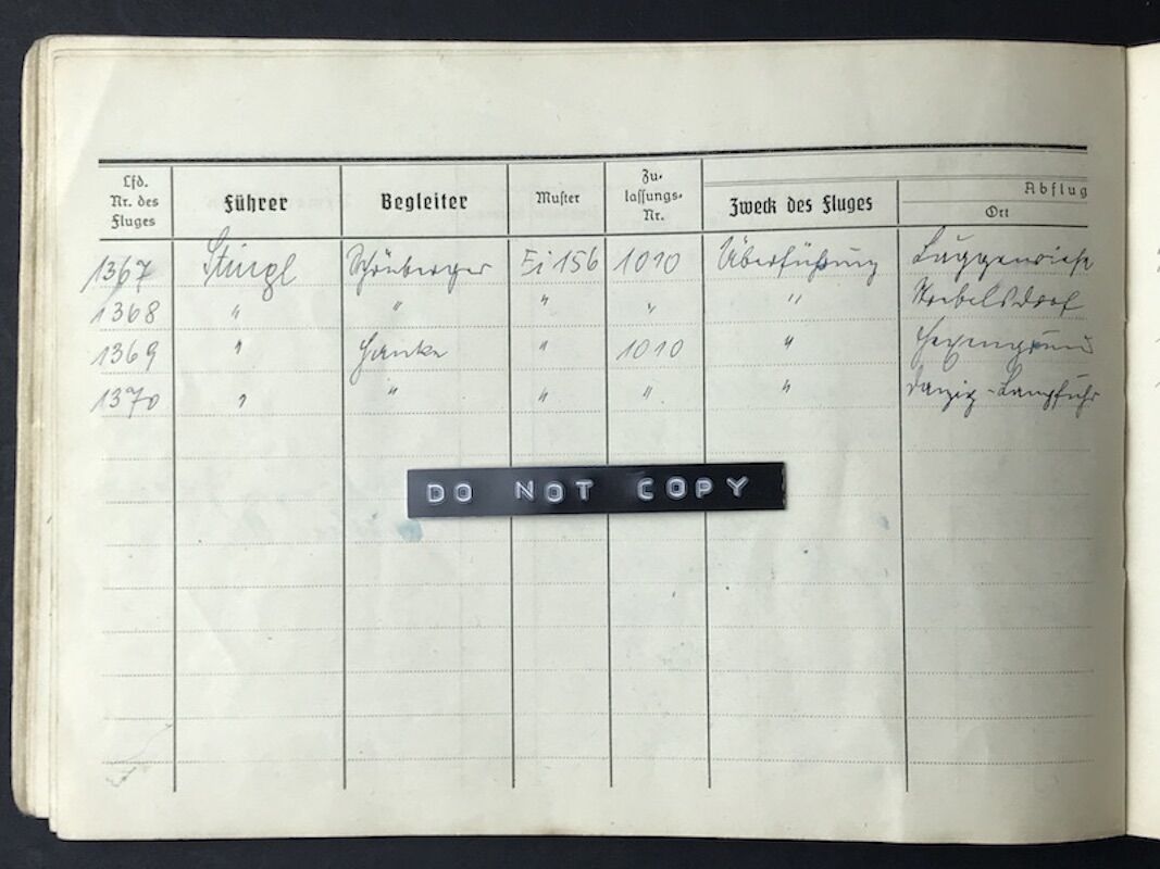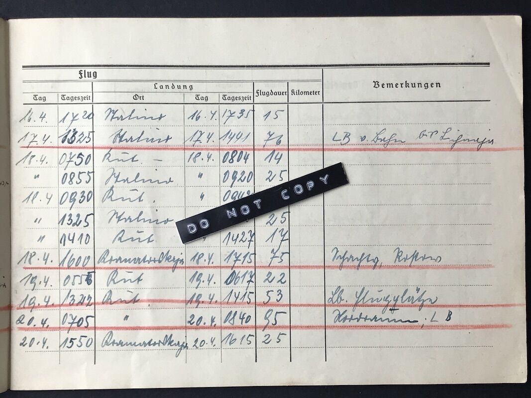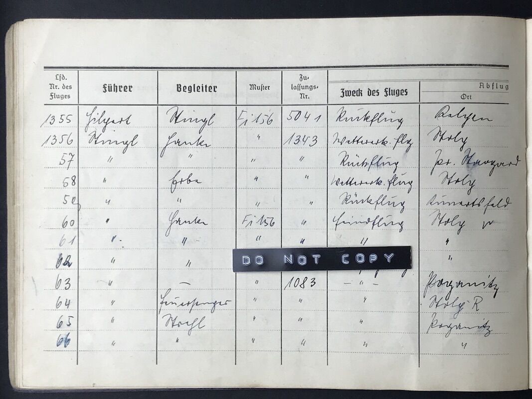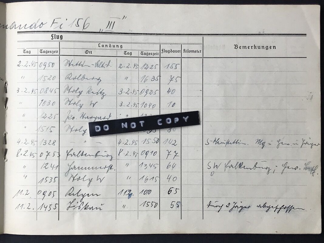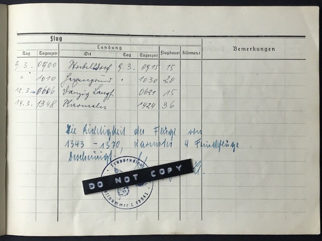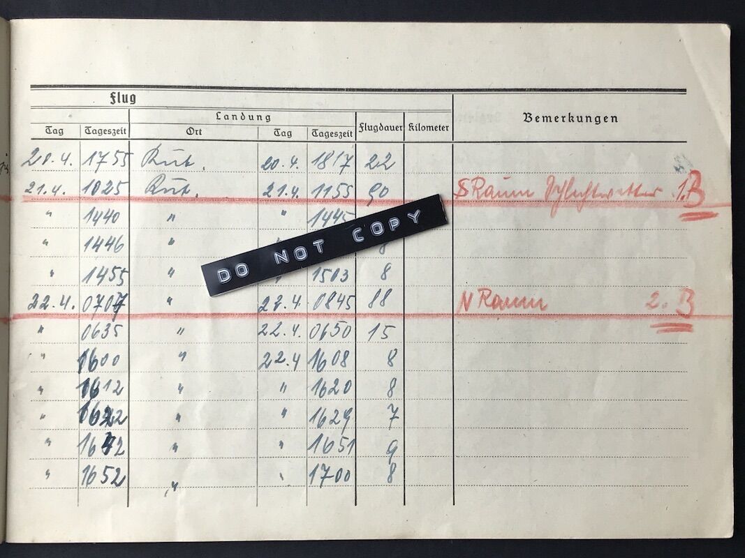 Interestingly, the Flugbuch displays an array of different flights, many of which were in enemy territory. It would also seem that not only was he in combat with the enemy in the air and ground targets but he was also shot down a few times. An interesting discussion about Stingls plane as well as pictures can be found here: