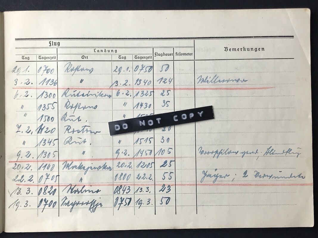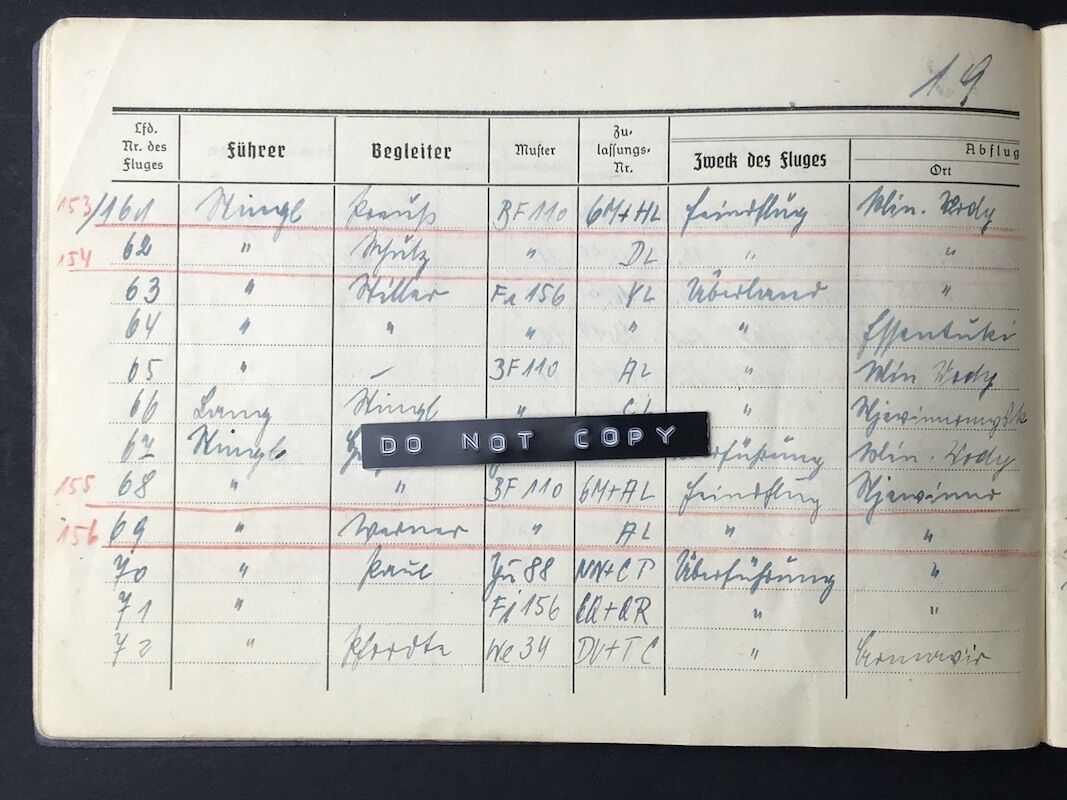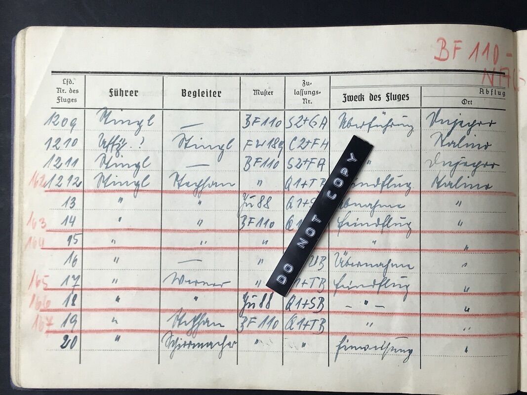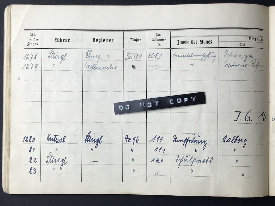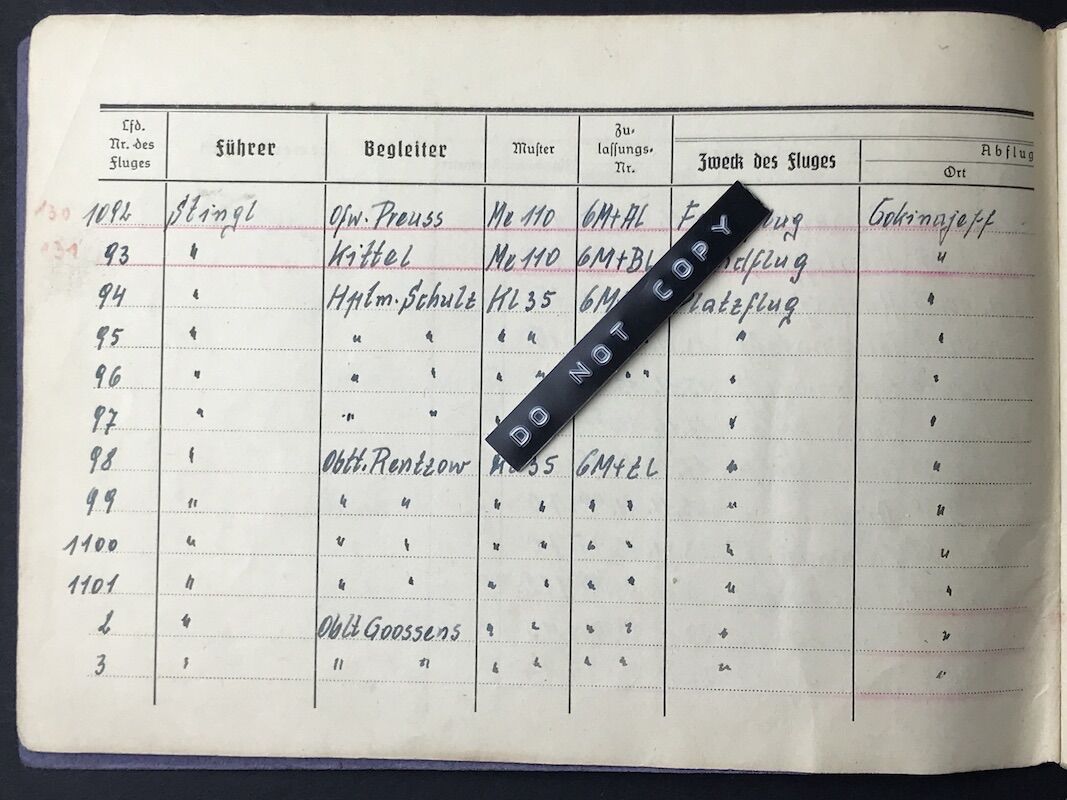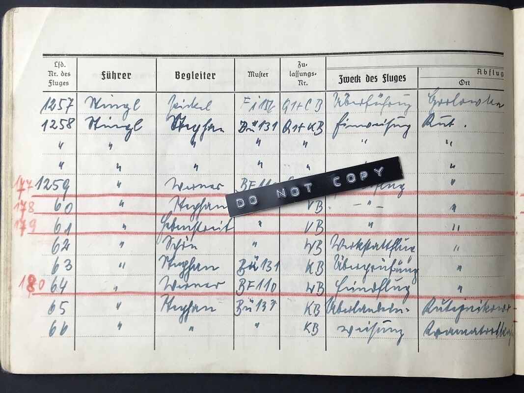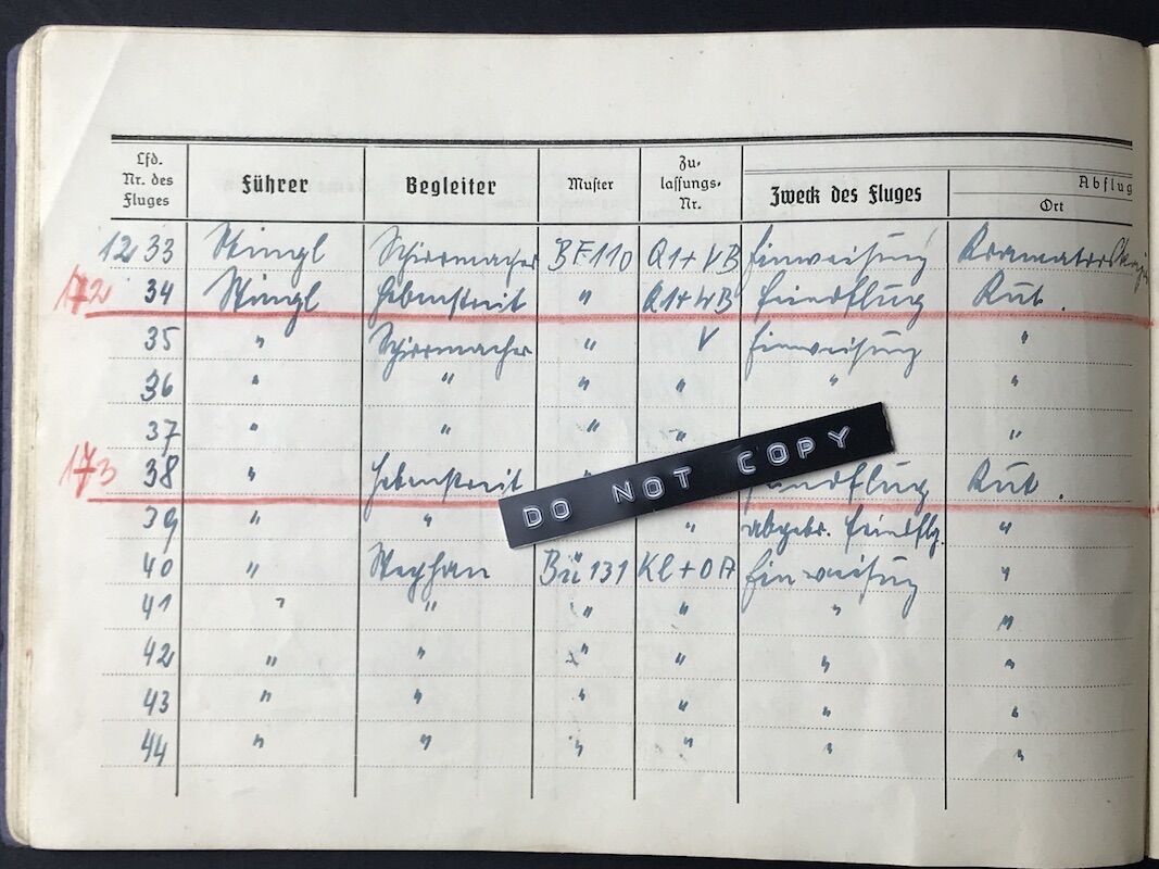 Interestingly, the Flugbuch displays an array of different flights, many of which were in enemy territory. It would also seem that not only was he in combat with the enemy in the air and ground targets but he was also shot down a few times. An interesting discussion about Stingls plane as well as pictures can be found here: