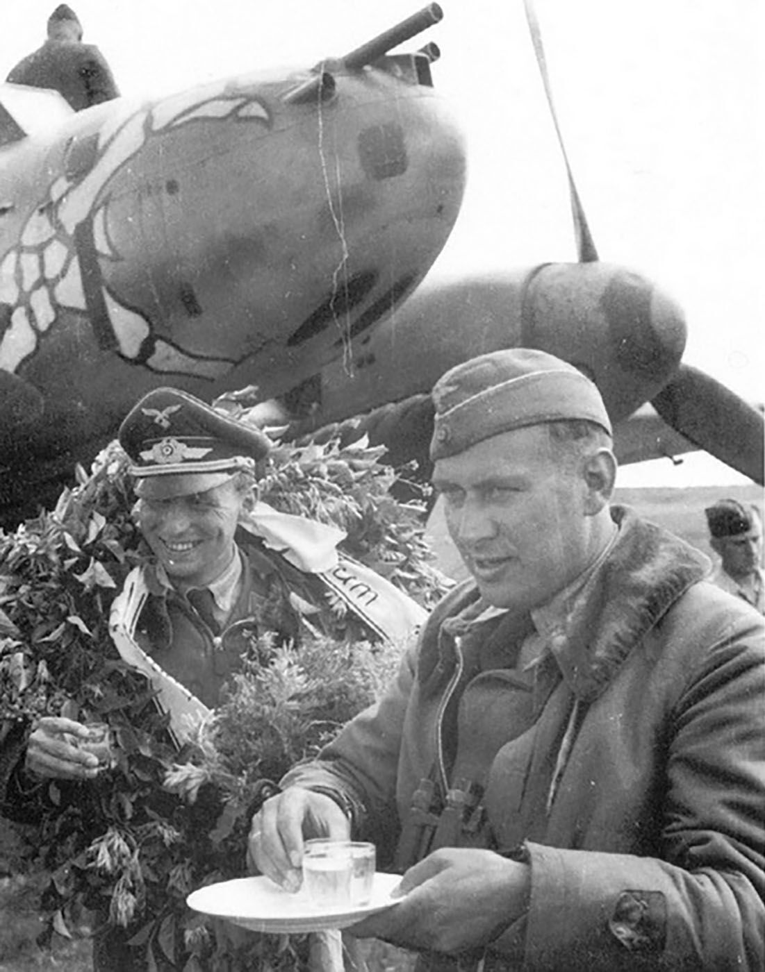 According to his Flugbuch, Stingl was in the aircraft below. Seen here, after landing and hit with rounds or enemy flak and once again Stingl can be seen after a celebration with a shot in his hand. This aircraft was used in various games a the model Bf110F, the Death hand being the markings of interest.