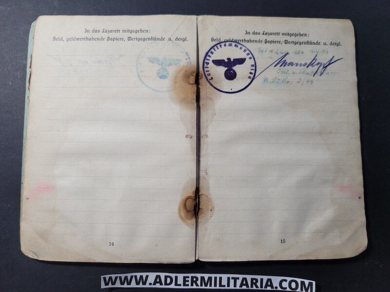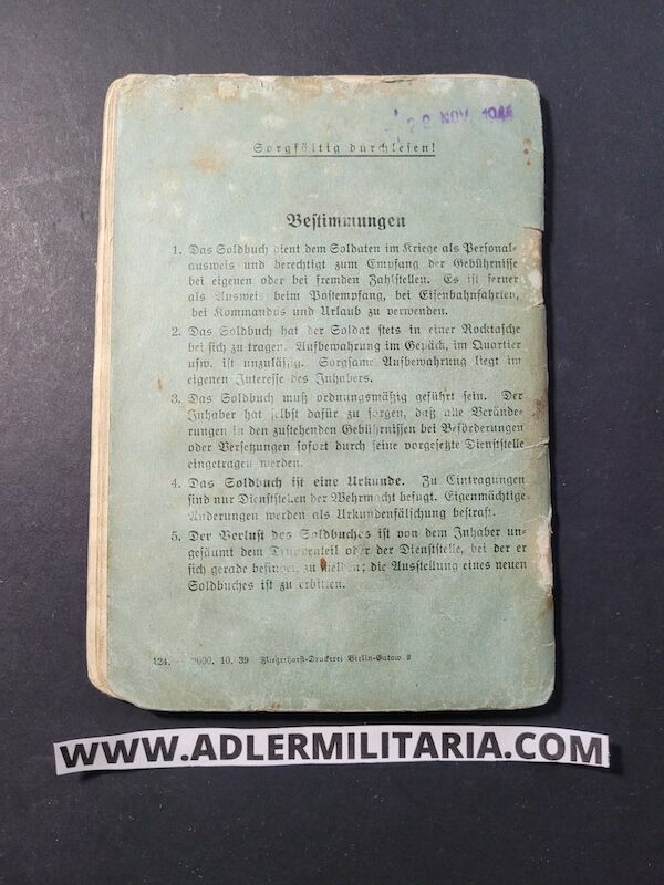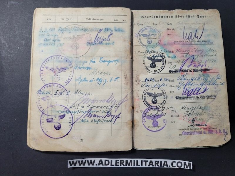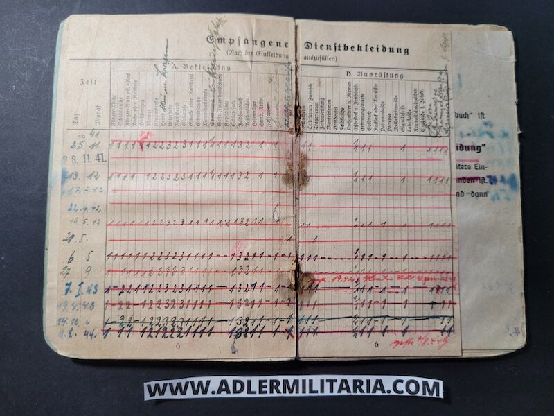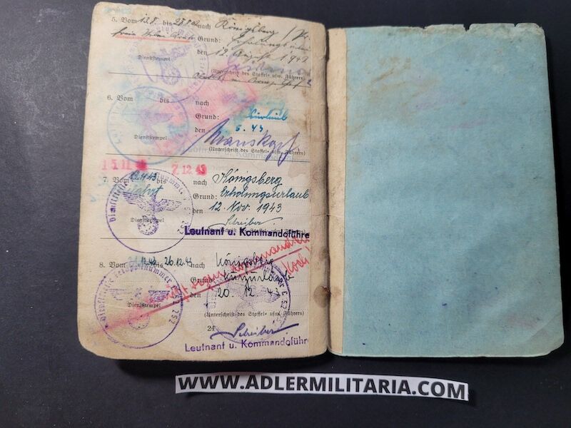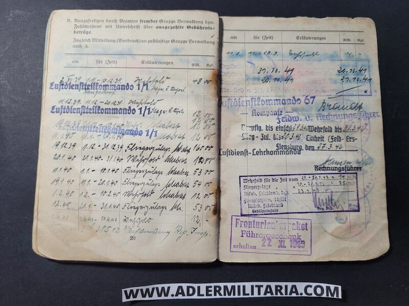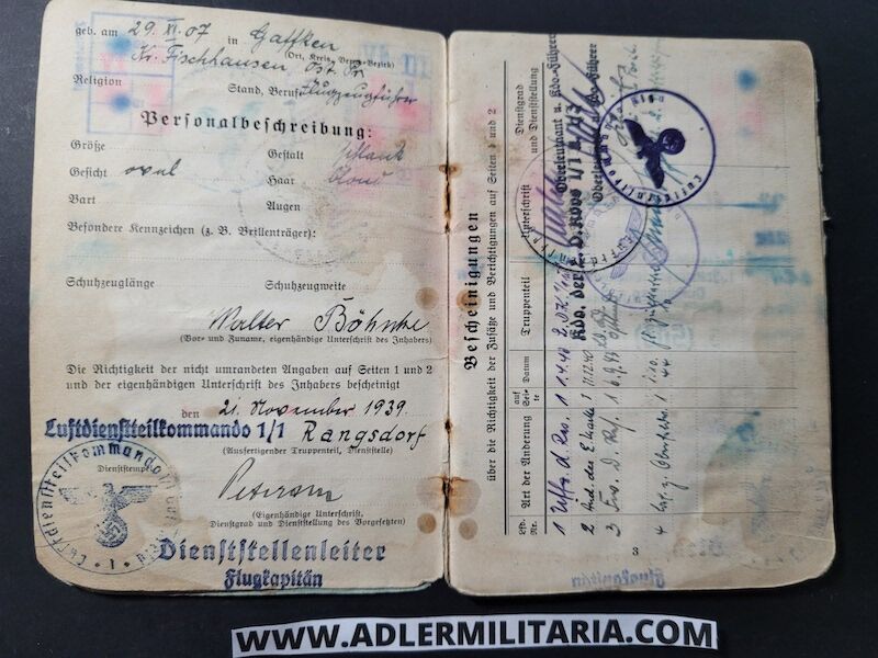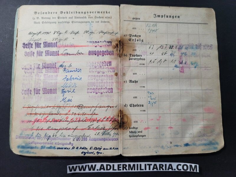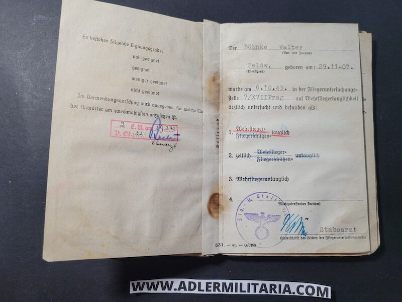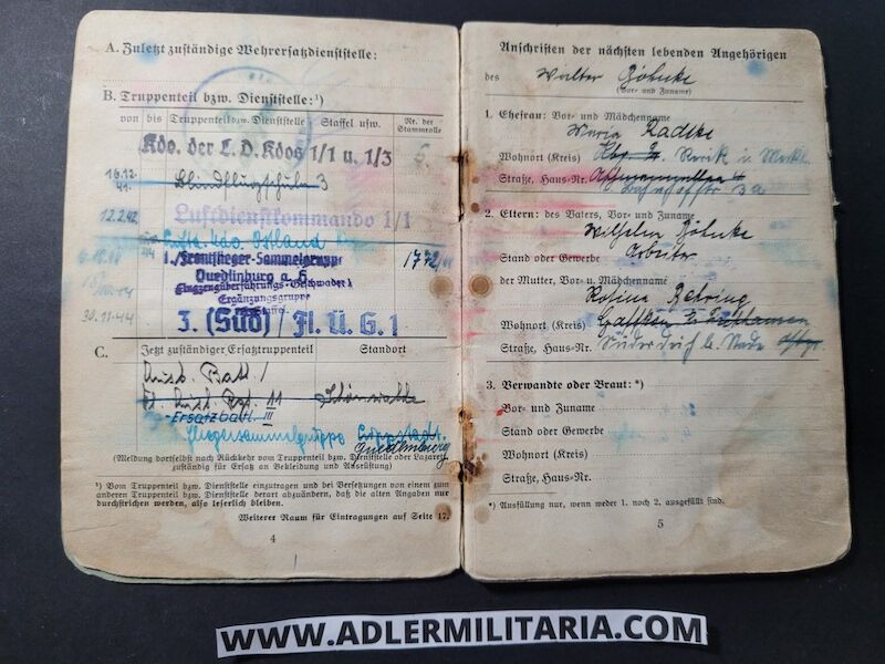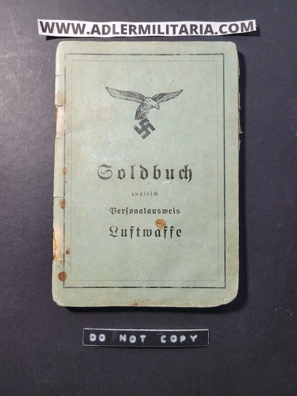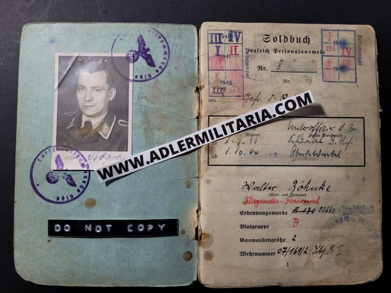 The Soldbuch is a 100% complete with all pages and the portrait photo. Notice the rare light blue variant of the Luftwaffe Soldbuch which was made in Berlin Gatow!