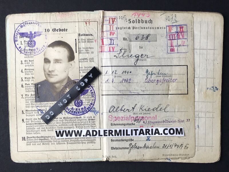 Luftwaffe Soldbuch to Obergefreiter Kiedel.