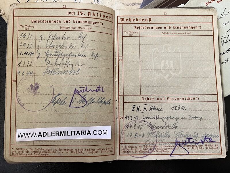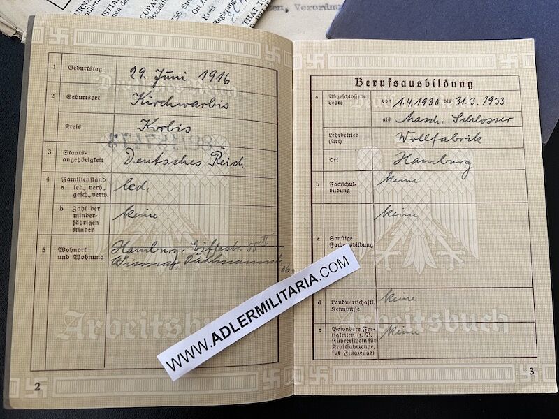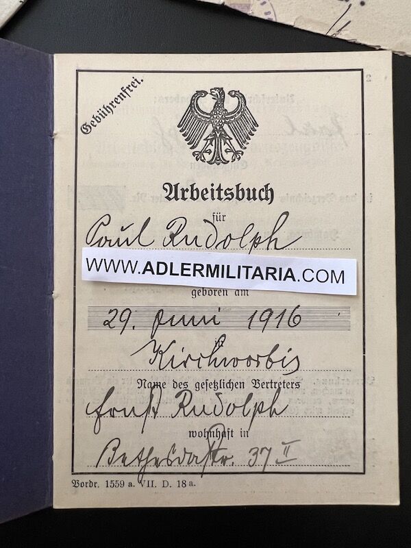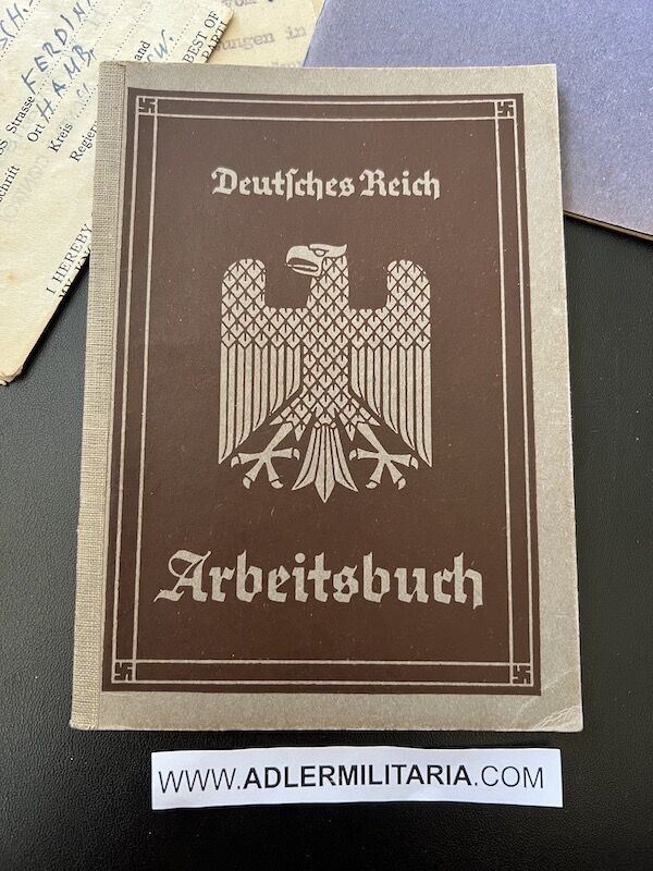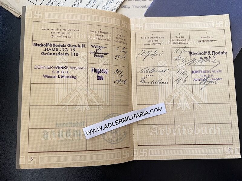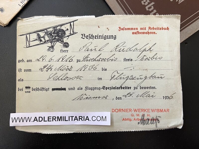 A super nice Wehrpass to a well decorated air crew member. Comes with his capture paperwork. Also his prewar work IDs, show he was working as a mechanic in building aircraft with Dornier. Please note the cover of the Wehrpass is in normal condition with Swastica.