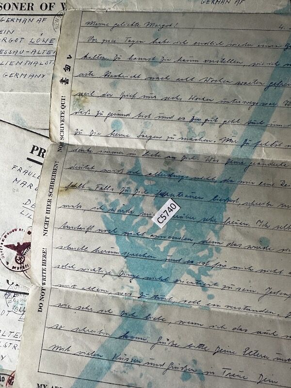 His letters are all highly censored by the German High Command, every envelope was opened first by US Censor and then in Germany. Including a water ink test to look for invisible ink.