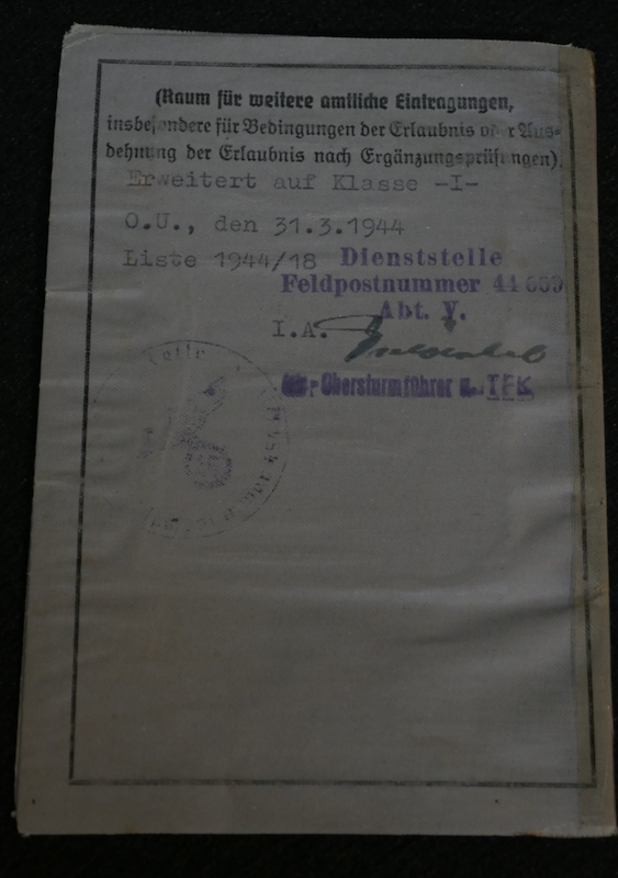 SS Drivers Licence – Issued by Feldpost Nr 46000 ( Prinz Eugen) in 1942 – Many nice signatures to see on it as well as a nice photograph in Uniform. He acquired the licence for Car first and for Motorcycle in 1944.