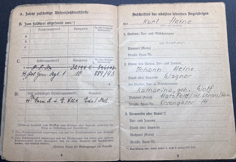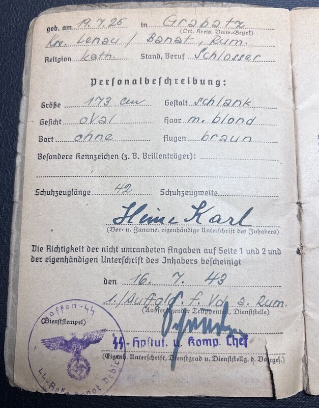Here we have a very interesting SS Soldbuch to Karl Heine, born in 19.7.1925 in Grabatz, Banat Romania.