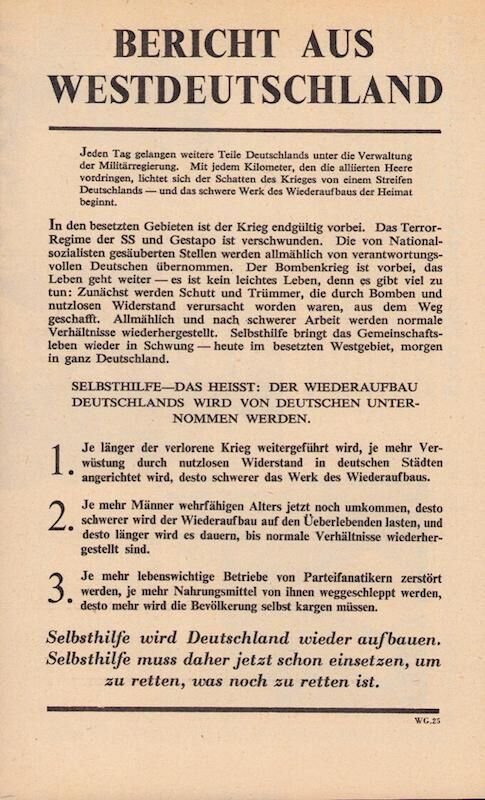 The longer the lost war is continued, the more destruction is caused by useless resistance in German cities, the harder the work of rebuilding will be.