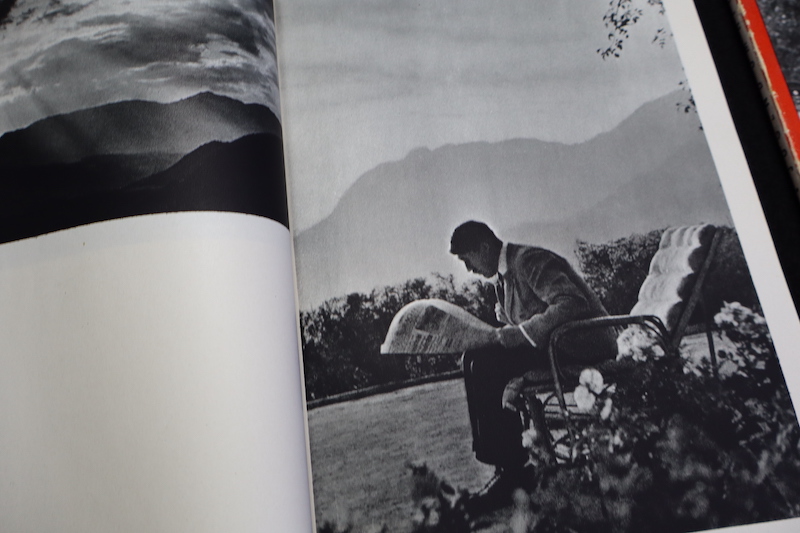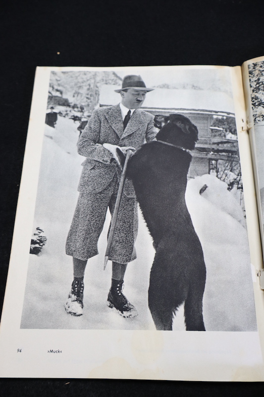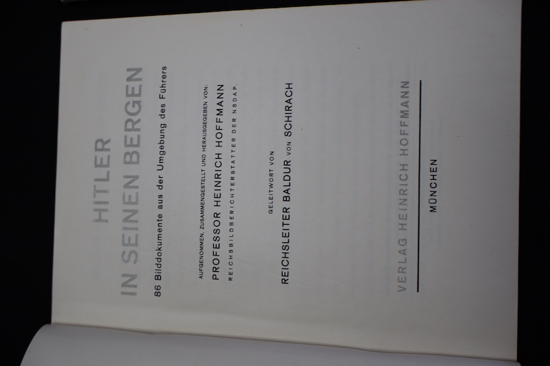“Hitler in Seinen Bergen” is a 96 page book published by Heinrich Hoffmann in 1935 with a foreword by Hitler Youth leader Baldur von Schirach. It contains an incredible compilation of 86 of Hoffmann’s photographs of Hitler “resting” at the Berghof: playing with his dogs, hiking in the snow, and hanging out with locals in his neighborhood. This collection of pictures provided a thorough and excellent overview of Adolf Hitler’s “unofficial” life in the one place he continually found peace and refuge from all the complications and pressures associated with statesmanship.