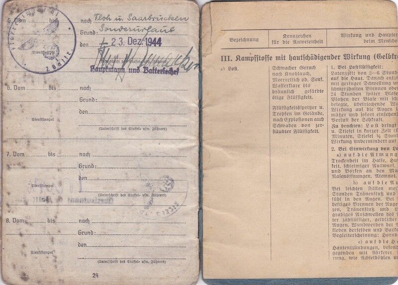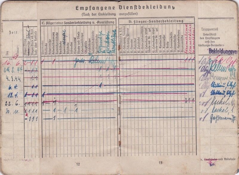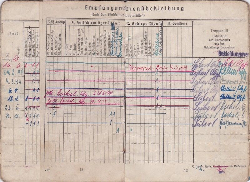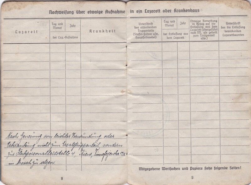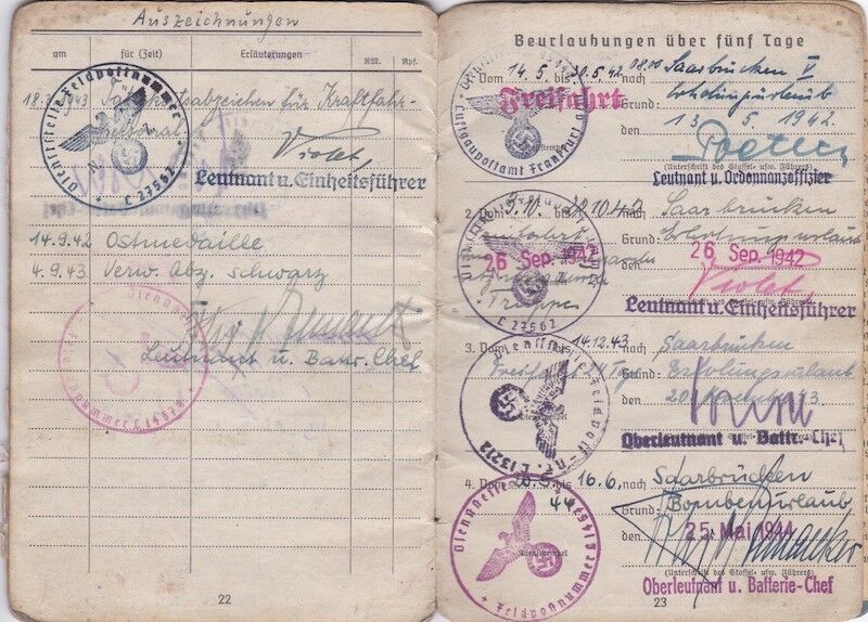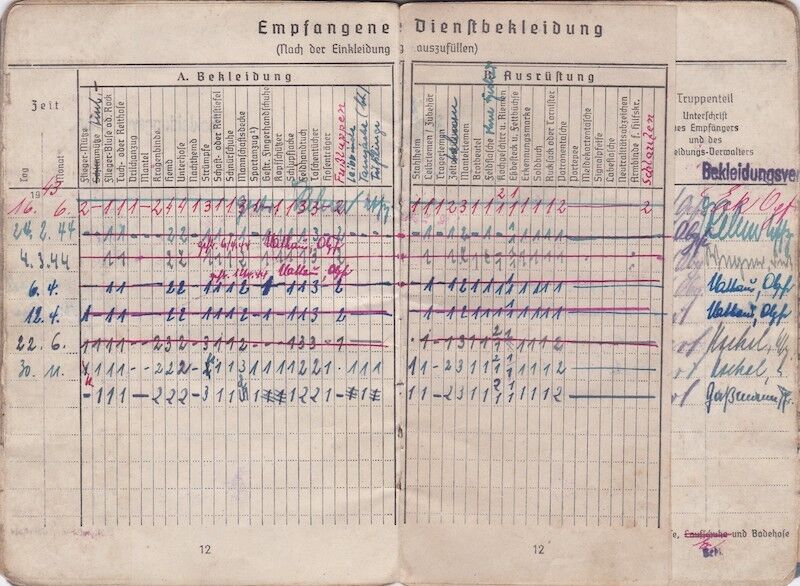 Trade Badge for Drivers – 1943, Eastern Front Medal – 1942, Black Wounds Badge – September 1943. He was lightly wounded in Ukraine, and seems stationed in Kyiv.