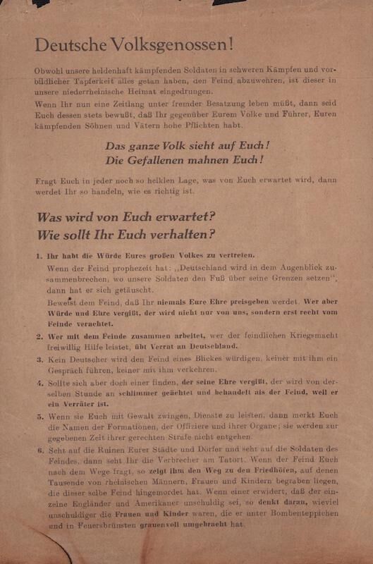 The leaflet is addressed to “Deutsche Volksgenossen!” (German compatriots!) and was designed to instruct civilians in occupied or soon-to-be occupied territories on how to behave when Allied forces advanced into their towns and cities.