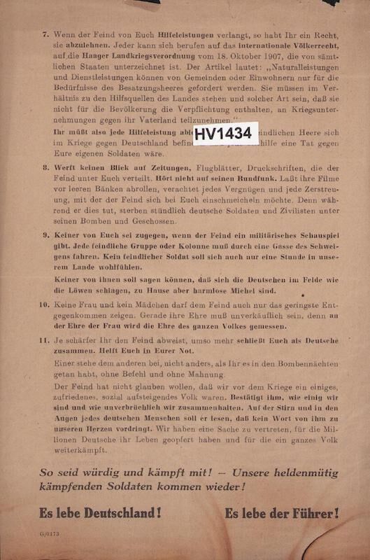 8. Do not look at newspapers, leaflets, or printed matter distributed by the enemy. Do not listen to his radio. Let his films roll before empty benches, despise every amusement and distraction with which the enemy wants to ingratiate himself with you. For every hour that you indulge in such things, German soldiers and civilians are dying under his bombs and shells.