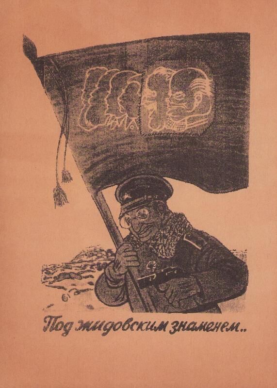 A caricature of a Jewish-looking Soviet officer holding a flag. On the flag are outlined portraits of Lenin, Stalin, and other Bolshevik leaders.