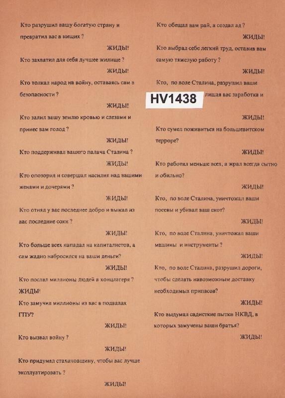 It consists of a list of rhetorical questions blaming Jews for every problem under Soviet rule. After each question, the answer given is always: “Jews!” (ЖИДЫ).