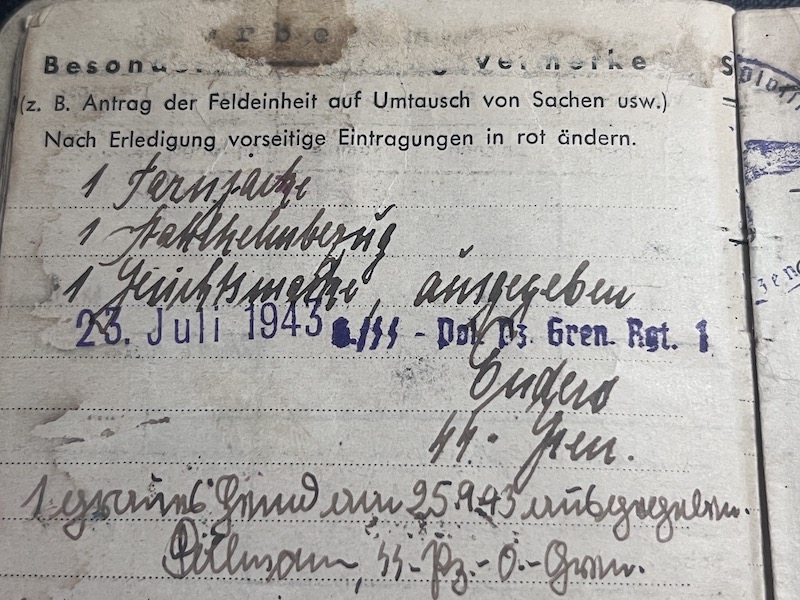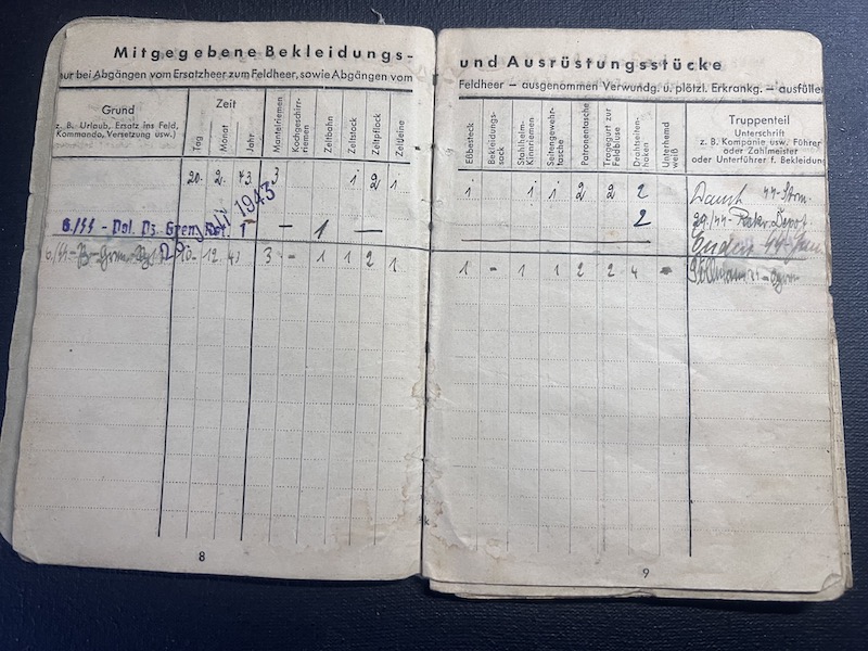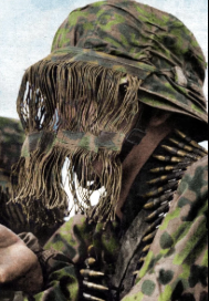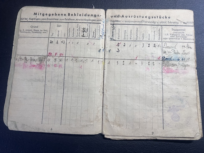 One of the rarest entries I have seen to date in the equipment list is the issuing of all three items together, in July 1943. Tarnjacke (SS Camo Jacket or Smock), Stahlheluberzug (SS Helmet Cover), Gesichtsmaske (Face Mask!!). Also note the issing of a Sniper Scope at the top of the weapons/equipment page for July 1943 the same time he was given the full camo equipment.