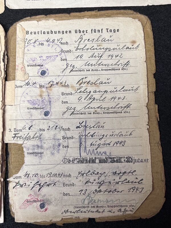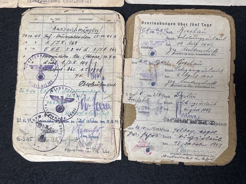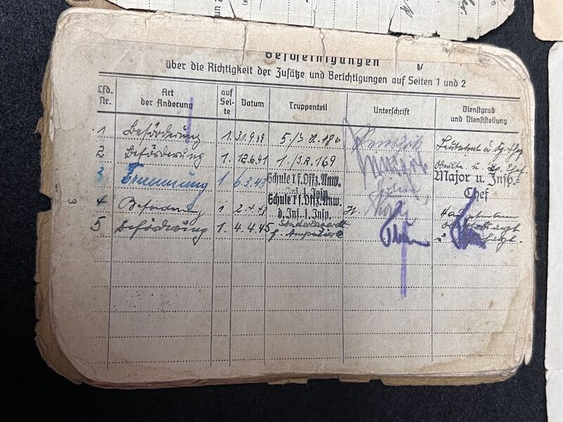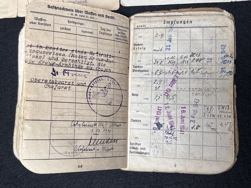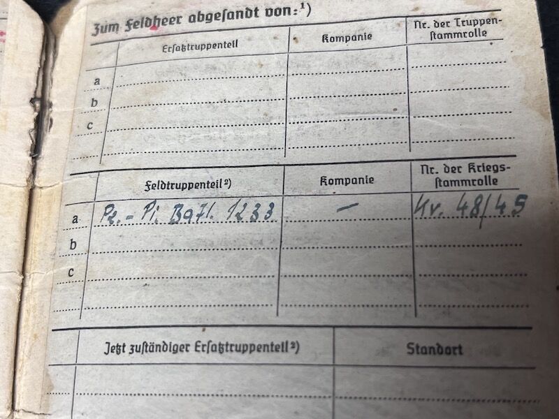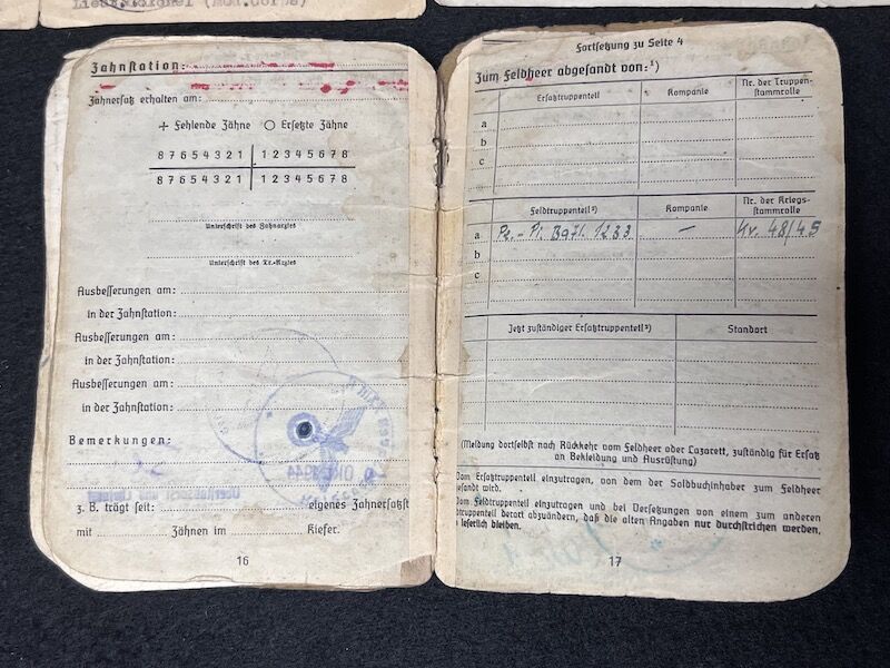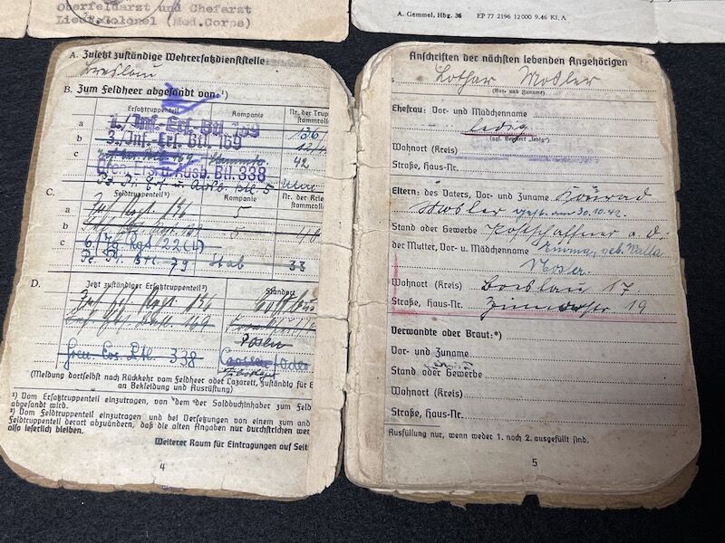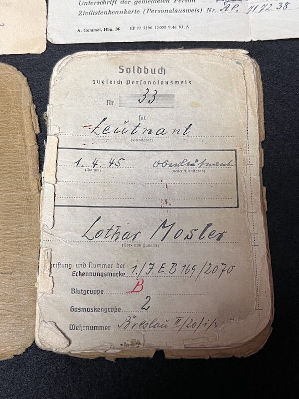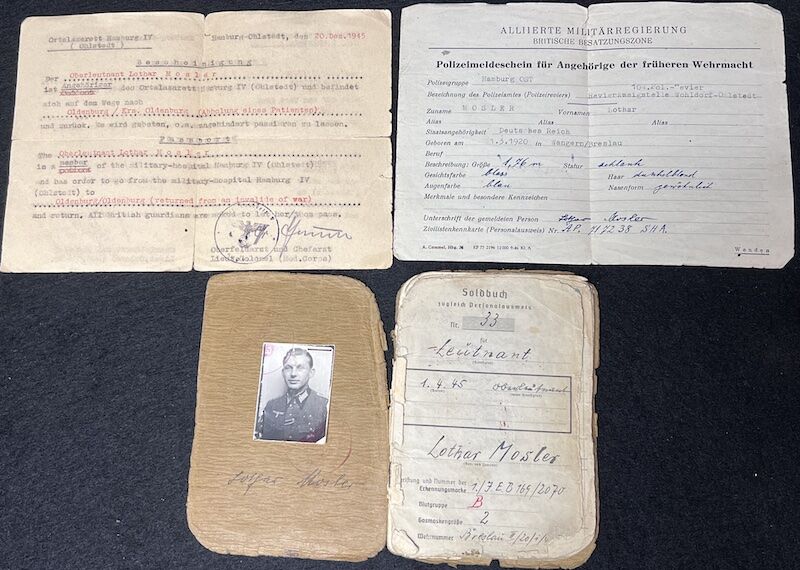 Original WWII German Wehrmacht Soldbuch – Oberleutnant Lothar Mosler – Iron Cross First Class – Panzer Pionier Batl 1233 – 233 Panzer Division – Wounded in Denmark 1945!!
