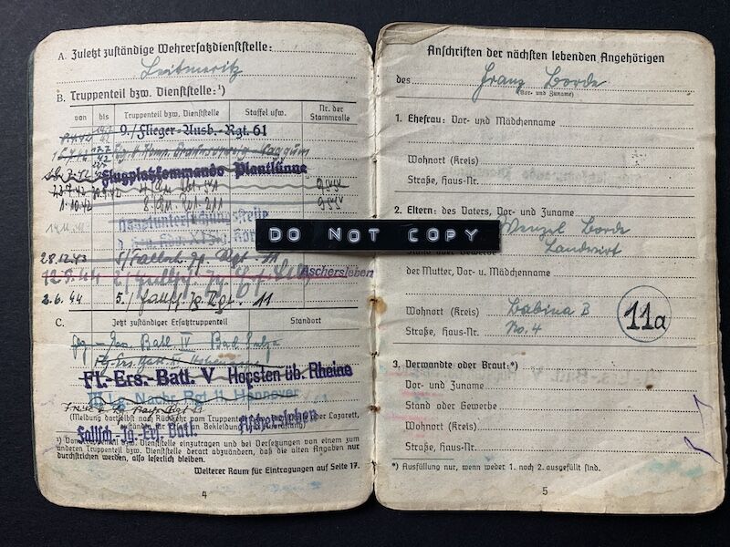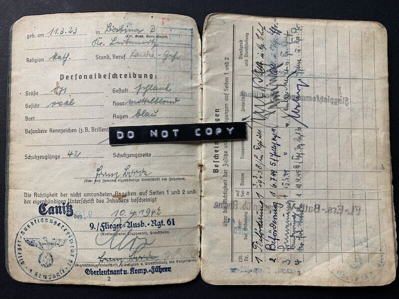 Borde was enlisted, and issued a Soldbuch on the 10.4.1942 in Canitz, with Flieger Ausb Rgt 61 – the unit was dedicated to training Luftwaffe recruits. Borde would spend some time in Braunschweig and Plantlünne on various airbases before being reassigned to: