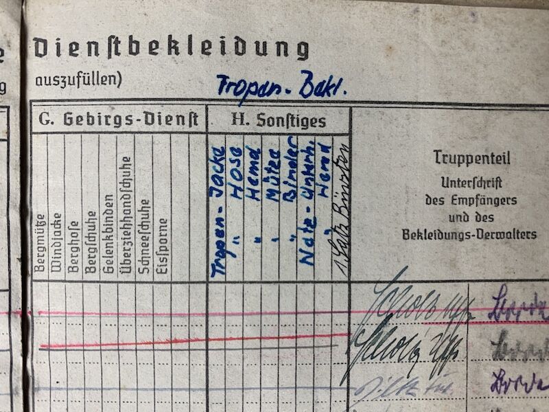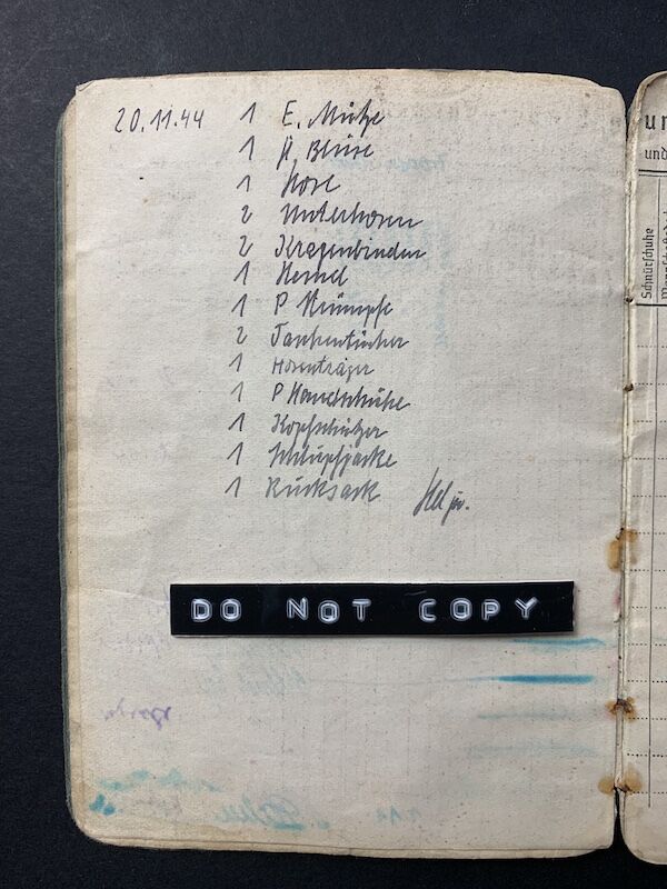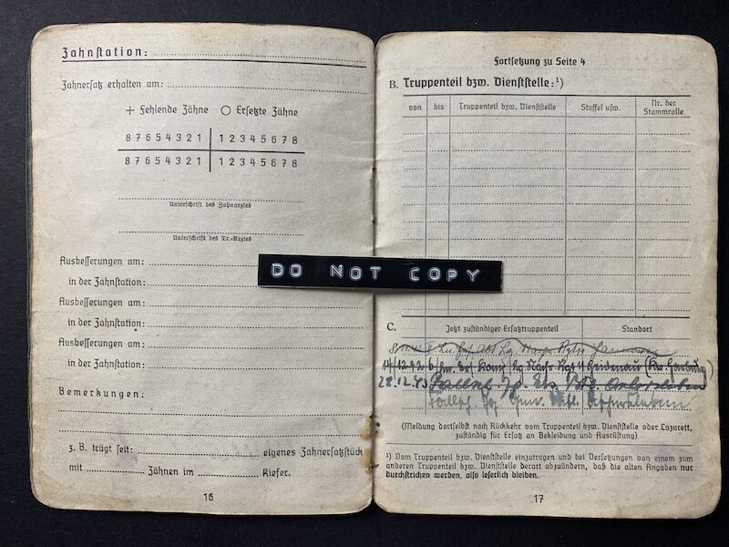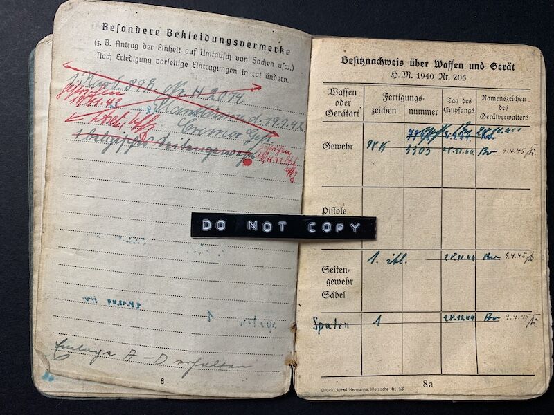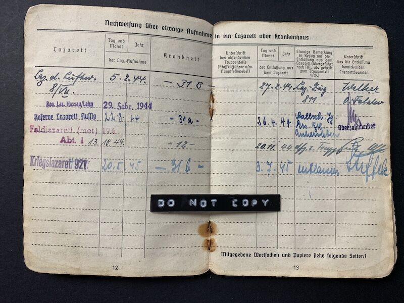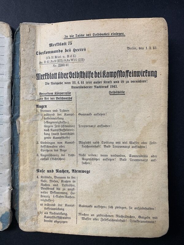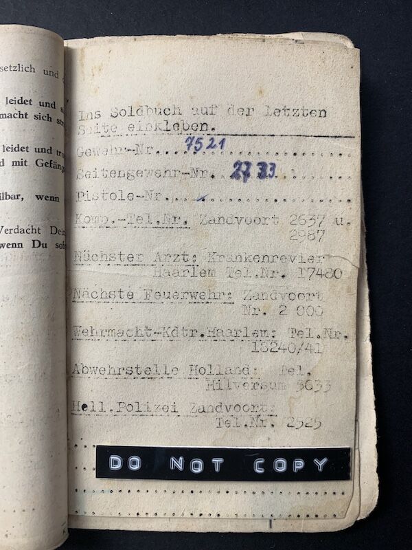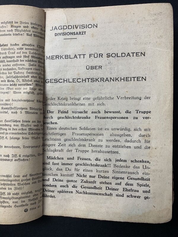 There is a Merkblatt for Sexually Transmitted Diseases – issued by the 1st Jagddivision. Warning soldiers of the effects of excessive drinking and having sexual relations. There is also a warning on the affects of chemical warfare. As well as a permit to carry a weapon in Occupied Holland with the local police numbers.