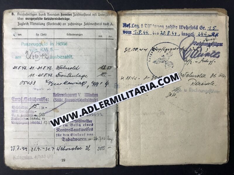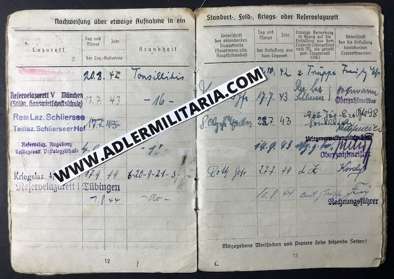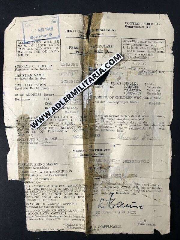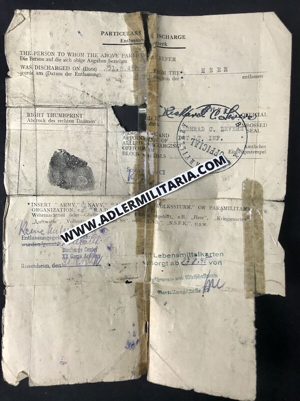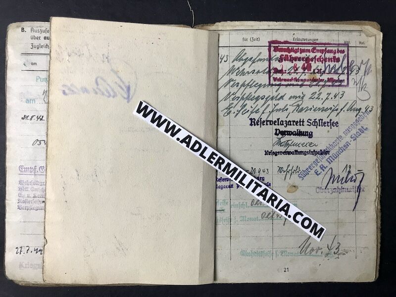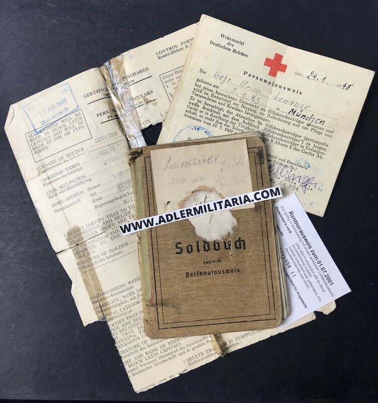 Interestingly his capture papers/discharge were tucked in the back of his Soldbuch and a note in the back of the Red Cross ID shows he was employed by US forces in Rosenheim in a Military hospital before he was discharged. Lastly, in the Soldbuch was a small slip of paper from his wife in connection with his pension in July 2001.