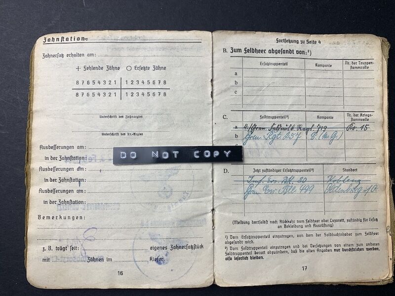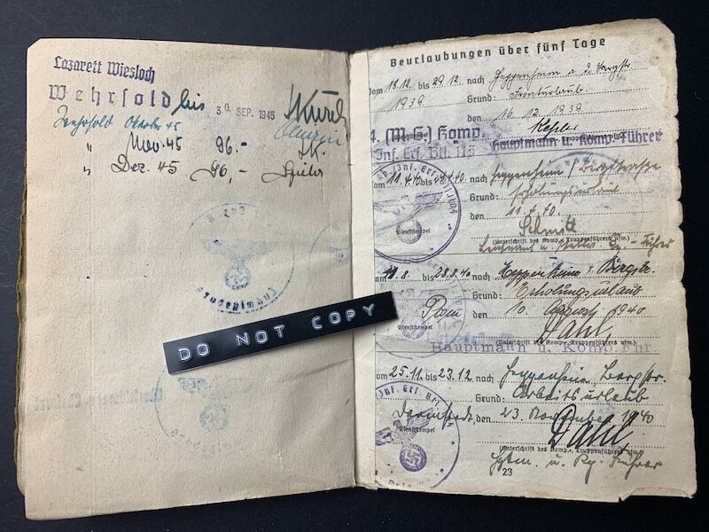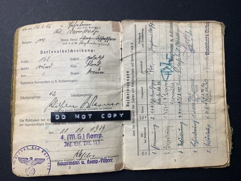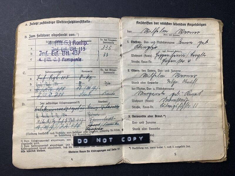 His Soldbuch was issued on 11.11.1939 with Infanterie Ersatz Batl 115, the M.G Company.