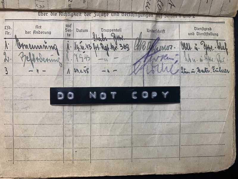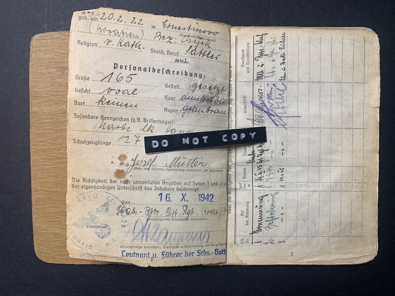 The Soldbuch was opened on he 16th of October 1942 with the Stabs Batterie of the the Artillerie Regiment (Kroat) 369.
