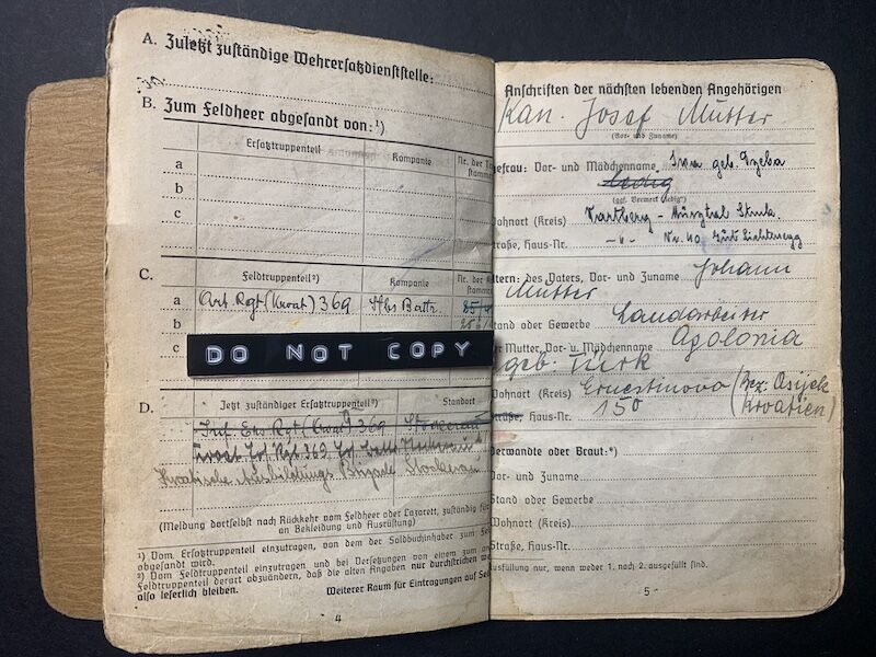 Soldbuch – Obergefreiter Mutter – Croatian Legion – 369 (Kroat) Art Reg – (369ID) (SOLD)