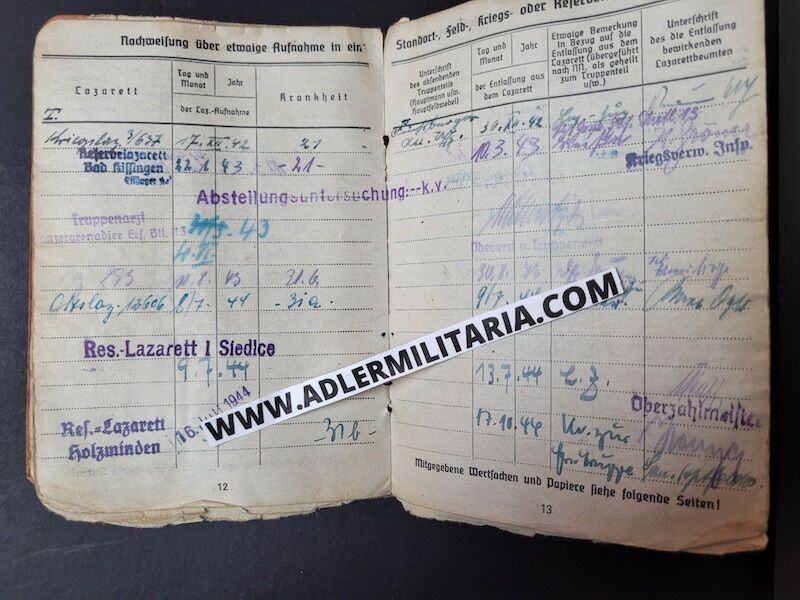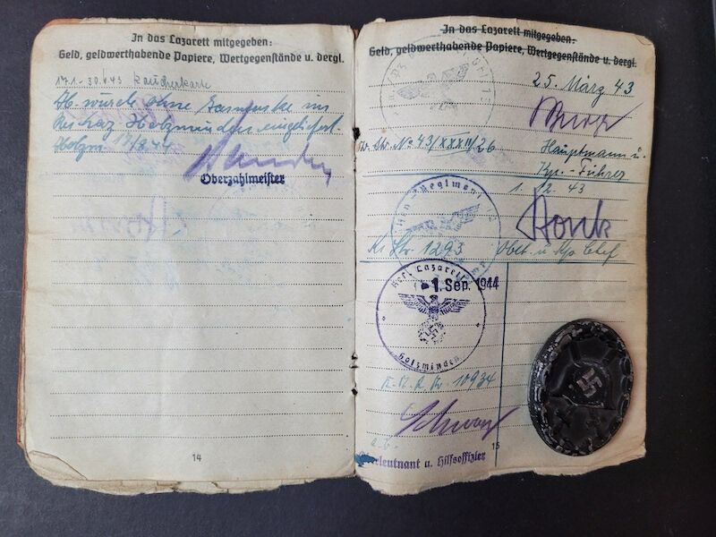 - Soldbuch – Missing rear part Page 21 on, looks to have been pulled due to blood staining.