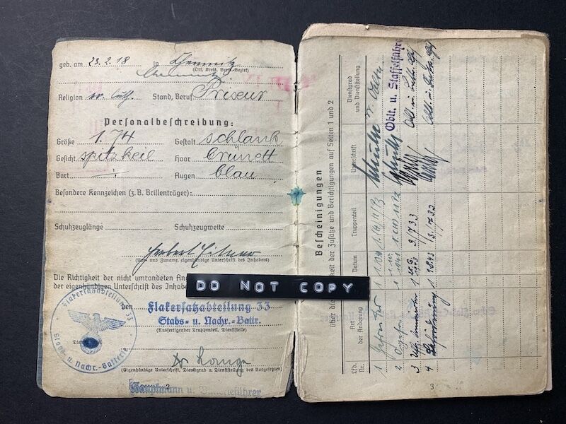 On the 2.1942 – 8.1944 – Flakabteilung 733 in Berlin Tegel – Awarded the: Flak Artillerie Specialist Badge